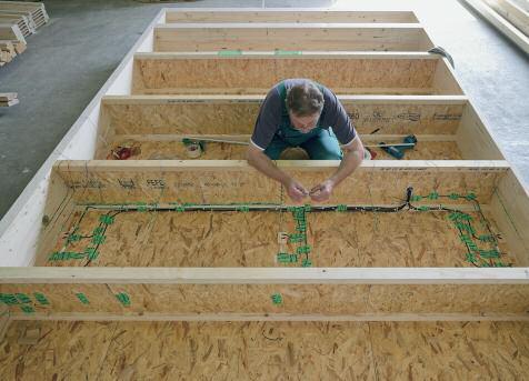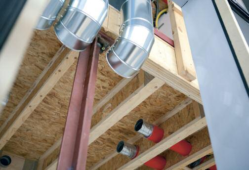 c) le tubazioni della VMC; d) la parte dell’edificio adibita all’abitazione; e) uno dei sensori inseriti all’interno delle pareti per monitorare il comportamento dell’umidità all’interno di queste; f) la posa dei sensori all’interno della struttura portante in legno in fase di prefabbricazione