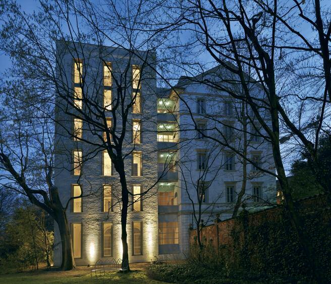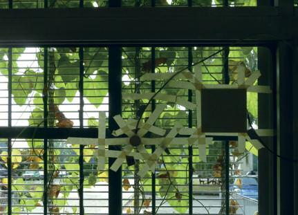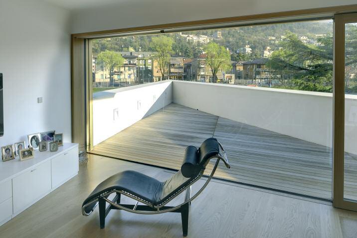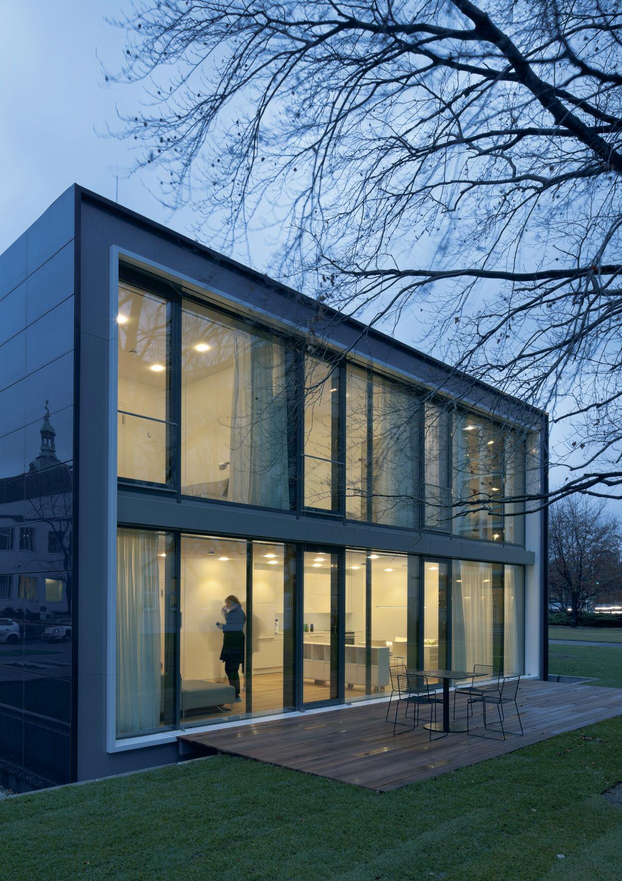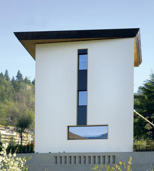 Sul lato est, uno schermo solare esterno a lamelle e manovrabile fornisce l’ombreggiamento impedendo il surriscaldamento dell’edificio Sul lato ovest questa funzione è data dalla “vetrina” posta davanti alla casa L’illuminazione artificiale, dimmerabile e gestita da rivelatori di presenza, avviene attraverso luci a LED ad alta efficienza