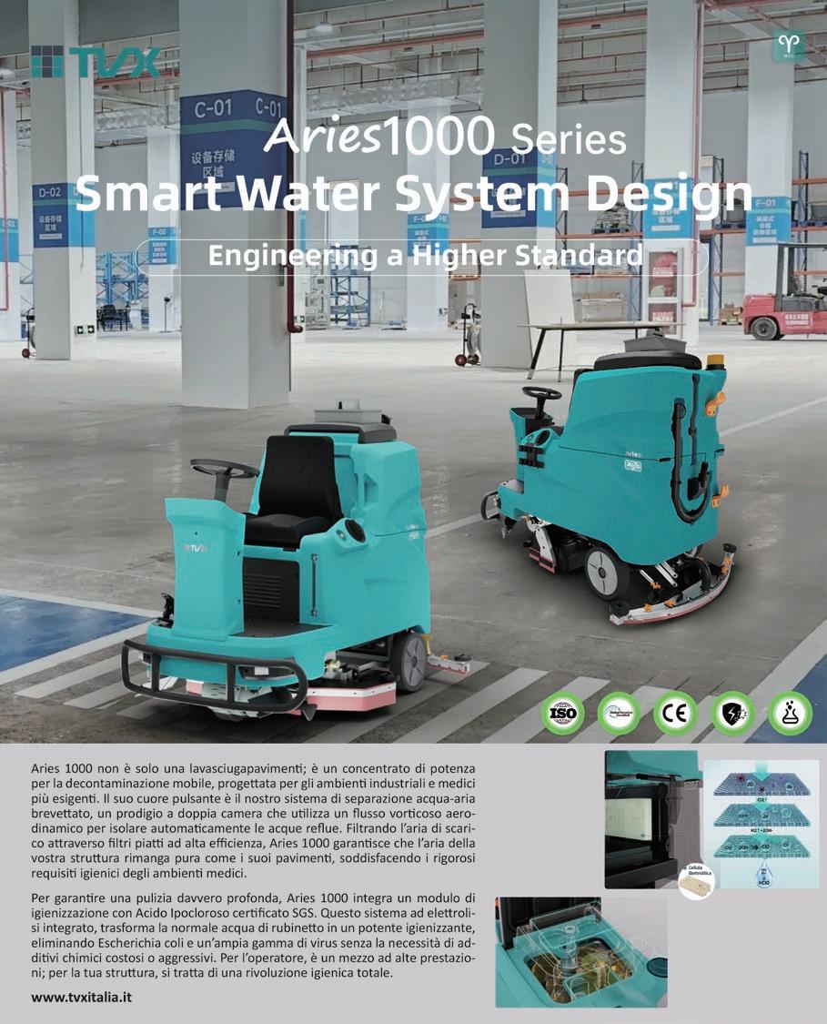 Il modello Aries 860, con doppia trazione posteriore, è studiato per affrontare pendenze e superfici irregolari tipiche delle aree di carico e scarico dei magazzini. La Aries 1000 aumenta la produttività grazie a serbatoi più capienti e a una pista di pulizia più ampia, mentre la versione Aries 1000 C, dotata di spazzole cilindriche, garantisce prestazioni superiori su pavimentazioni irregolari, penetrando nelle fughe delle piastrelle e nei rivestimenti epossidici usurati per una pulizia più profonda.