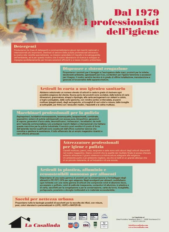 La Casalinda opera da oltre quarant’anni nel settore del cleaning professionale, proponendosi come partner strutturato per aziende e operatori che necessitano di soluzioni affidabili per l’igiene, la pulizia e la sanificazione degli ambienti e delle attrezzature. L’approccio dell’azienda unisce consulenza, fornitura e servizio, accompagnando il cliente nella scelta dei prodotti, dei macchinari e dei sistemi più idonei alle specifiche esigenze operative, con particolare attenzione all’efficacia e alla sostenibilità ambientale. Grazie a un’esperienza consolidata e a un’offerta ampia e costantemente aggiornata, La Casalinda è in grado di rispondere in modo efficace alle esigenze di molteplici settori professionali.