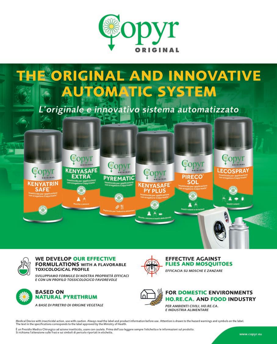 Daoltre 40 anni Copyr sviluppa soluzioni avanzate per il controllo degli insetti negli ambienti sensibili, offrendo la più ampia gamma di bombole insetticide progettate per l’erogazione automatizzata. Un’esperienza che trova applicazione ideale nei contesti professionali del settore Ho.Re.Ca., dove la presenza di insetti può compromettere igiene, sicurezza e qualità dell’esperienza per il cliente. Il cuore dell’offerta Copyr è rappresentato da sei bombole insetticide, studiate per garantire un’azione efficace, costante e controllata contro i principali insetti volanti, come mosche e zanzare. La gamma comprende KENYASAFE® EXTRA, KENYASAFE® PY PLUS, PYREMATIC e KENYATRIN® SAFE, oltre alle più recenti soluzioni PIRECO SOL® e LECOSPRAY. Le bombole condividono un elemento distintivo fondamentale: sono tutte a base di Piretro, principio attivo di origine vegetale estratto dai fiori di Chrysanthemum. Questa scelta consente di ottenere formulazioni efficaci e affidabili, particolarmente adatte all’utilizzo in ambienti interni e sensibili, dove è richiesta un’elevata attenzione agli standard di sicurezza.