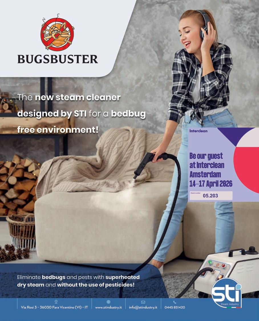 Il vapore saturo e surriscaldato penetra in profondità nelle superfici dei tessuti, eliminando sia le cimici dei letti che le loro uova, anche se depositate nei nascondigli più impenetrabili. Il vapore super secco generato non bagna materassi, tappezzerie, tessuti, ecc. L’uso di BugsBuster, inoltre, garantisce superfici molto pulite, prive di batteri e microrganismi. BugsBuster sarà esposto a Interclean Amsterdam 2026, presso lo stand STI Steam Industry #203, nel padiglione 5. www.stindustry.eu