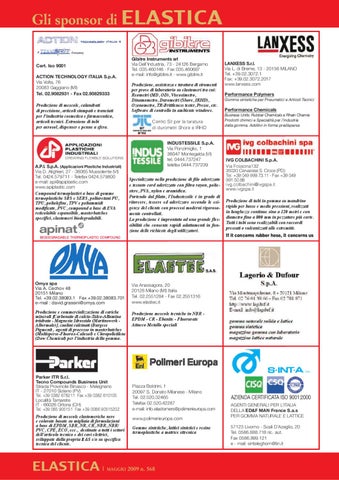 Gli sponsor di elastica Cert. Iso 9001 ACTION TECHNOLOGY ITALIA S.p.A. Via Volta, 76 20083 Gaggiano (MI) Tel. 02.9082931 - Fax 02.90829333 Produzione di mescole, calandrati di precisione, articoli stampati e tranciati per l’industria cosmetica e farmaceutica, articoli tecnici. Estrusione di tubi per aerosol, dispenser e penne a sfera.
