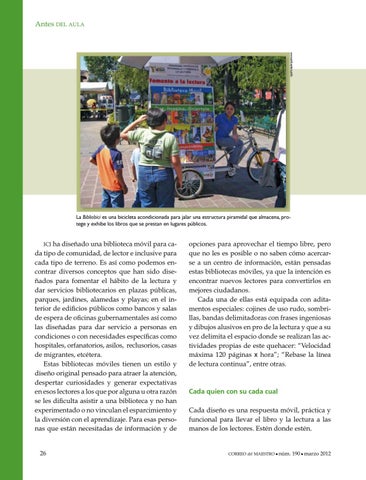 opciones para aprovechar el tiempo libre, pero que no les es posible o no saben cómo acercarse a un centro de información, están pensadas estas bibliotecas móviles, ya que la intención es encontrar nuevos lectores para convertirlos en mejores ciudadanos. Cada una de ellas está equipada con aditamentos especiales: cojines de uso rudo, sombrillas, bandas delimitadoras con frases ingeniosas y dibujos alusivos en pro de la lectura y que a su vez delimita el espacio donde se realizan las actividades propias de este quehacer: “Velocidad máxima 120 páginas x hora”; “Rebase la línea de lectura continua”, entre otras.