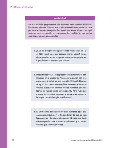 Actividad En esta ocasión proponemos una actividad para alumnos de bachillerato en adelante. Pueden tratar de resolverla con ayuda de otra persona y después comparar las soluciones entre sí para ver qué tanto se parecen, no sólo las respuestas sino también las estrategias que siguieron para encontrarlas.