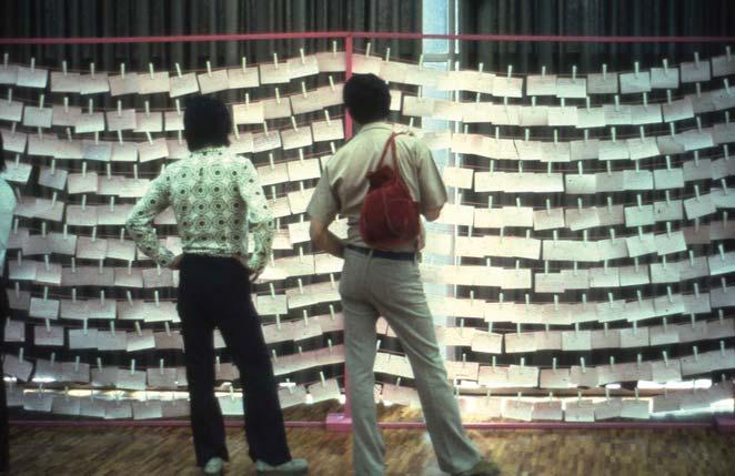 papeles color rosa (asociado a lo femenino), para evidenciar las diferentes violencias y disparidades que vivían las mujeres en ese tiempo. La pieza tuvo una fuerte respuesta y fue replicada por Mónica en Los Ángeles en 1979, en el contexto del proyecto Make it safe de Suzanne Lacy.11 Desde entonces, ha sido reactivada en múltiples contextos: por universidades, otras instituciones y con otras preguntas, alusivas a la denuncia, tales como “mi primer acoso fue…” o “tenía X edad cuando sufrí mi primer abuso”.