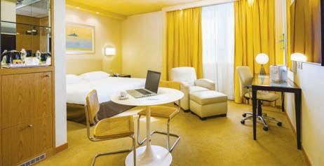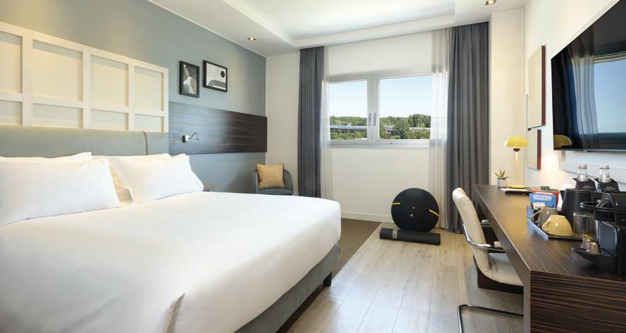 no gratuito, anche per bus, e un garage con colonnine di ricarica per auto elettriche completano il quadro. Ma vediamo più nel dettaglio la struttura: l’albergo offre 128 camere perfettamente equipaggiate di tutto (inclusi ferro e asse da stiro per i ritocchi dell’ultimo minuto) con postazione per lavorare, ampia scrivania, seduta ergonomica e multiprese. Le camere si suddividono tra standard e premium, queste ultime dotate di un exercise equipment firmato Technogym per svolgere in perfetta privacy meditazione o esercizi a corpo libero. In più, per chi non può fare a meno di una sessione sul tapis roulant, l’albergo mette a disposizione anche una sala fitness con macchinari Technogym accessibile 24 ore su 24.