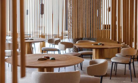 Lo spazio, ispirato alla natura e curato da Hangar Design Group, si distingue per materiali come legno, pietra e ceramica, con tonalità neutre e rilassanti. La luce proveniente dalle grandi vetrate crea un’atmosfera calda e accogliente.