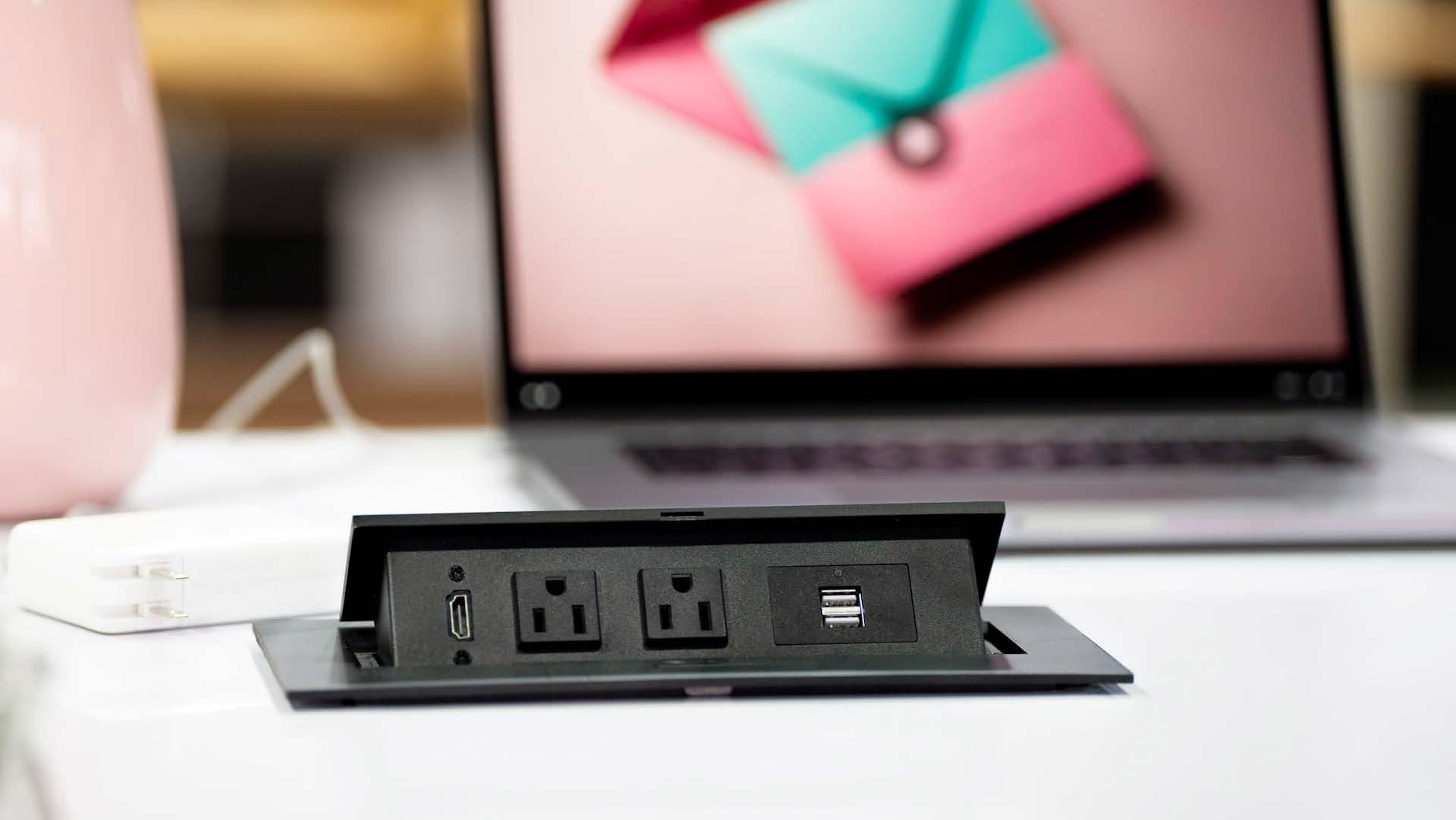Los centros de alimentación Round Furniture combinan un diseño elegante y moderno con la funcionalidad de USB y la alimentación tradicional.