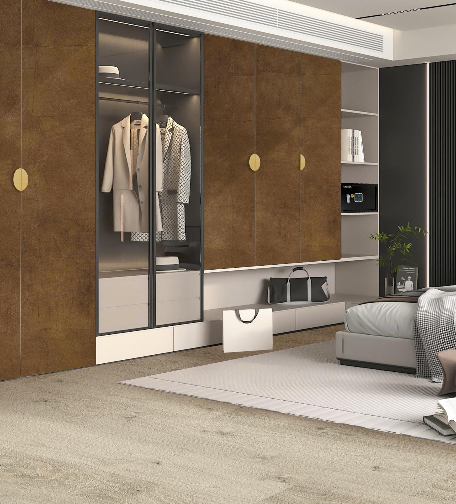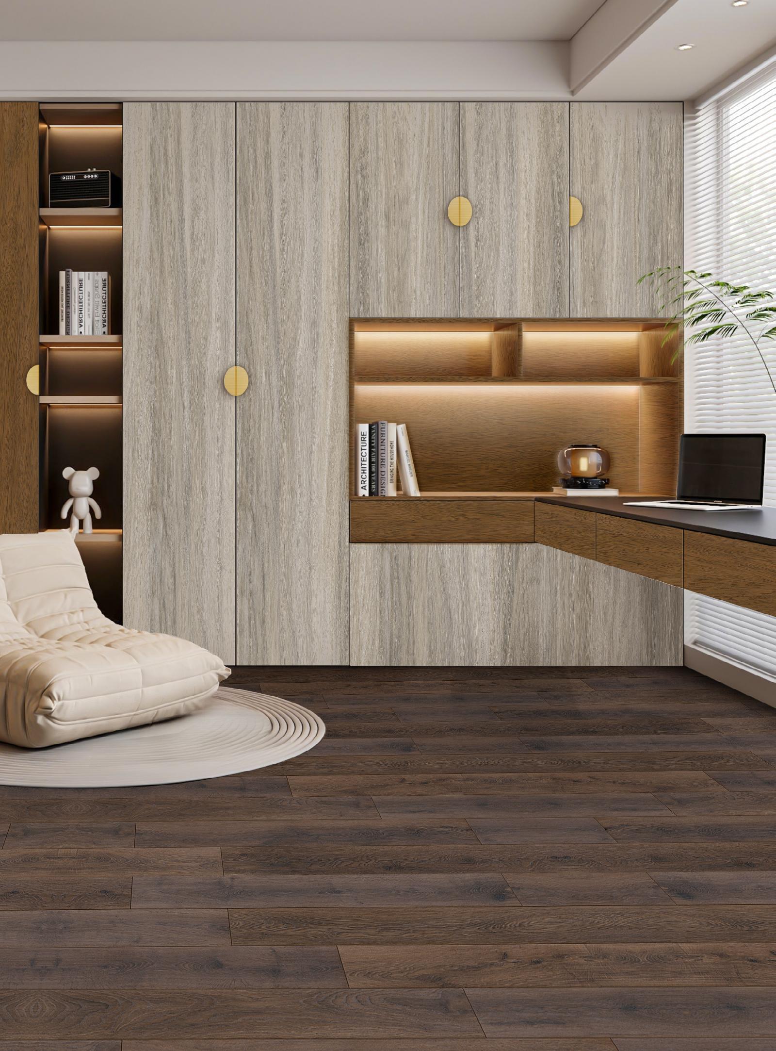 El tono Tierra aporta calidez y elegancia con vetas naturales. Perfecto para espacios acogedores y de alto tránsito, brinda resistencia a la humedad y mayor durabilidad que los laminados tradicionales.