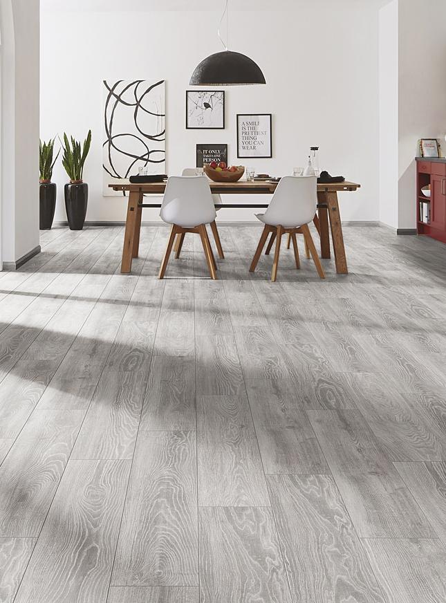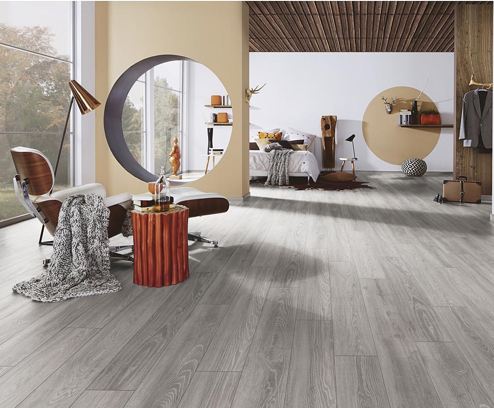 Una opción gris moderna para tu renovación. Roble Gris combina la elegancia del roble con tonos grises contemporáneos. Este piso laminado destaca por su amplitud visual y resistencia, ideal para remodelar cualquier espacio del hogar.
