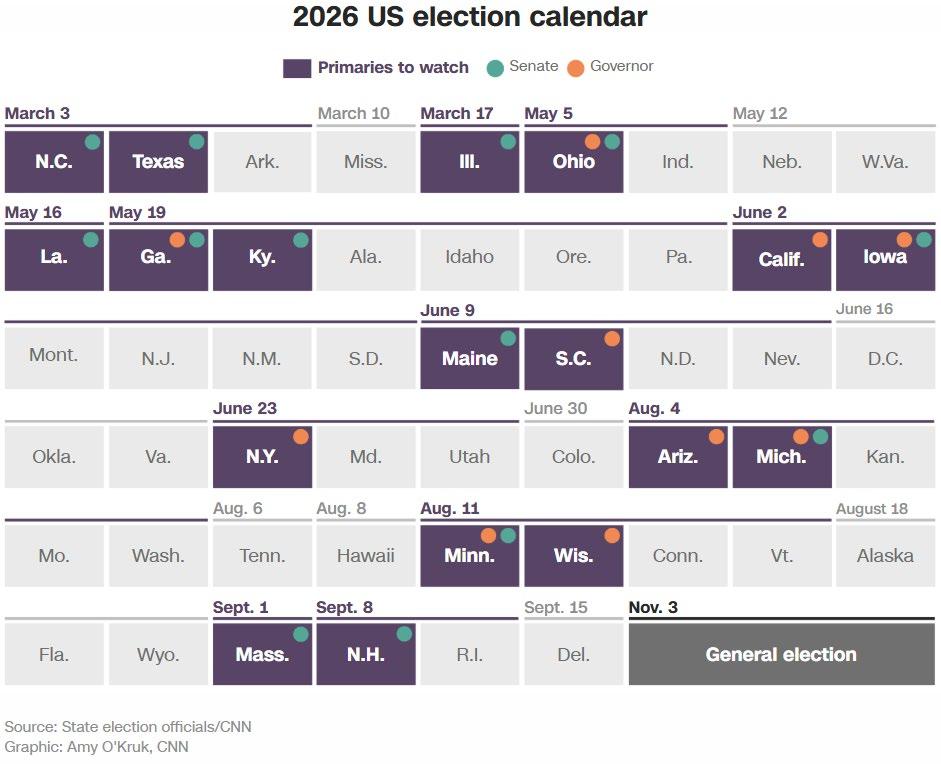 与此同时,候选人和党内领袖也将仔细分析选举结果, 为2028年总统大选做准备——那将是16年来首次没有特朗 普名字出现在选票上的全国性选举。以下是未来一年中,他 们——以及我们——将重点关注的关键日期与选战: