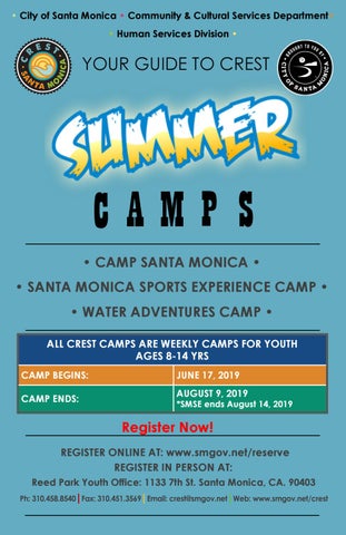 CAMP S • CAMP SANTA MONICA • • SANTA MONICA SPORTS EXPERIENCE CAMP • • WATER ADVENTURES CAMP • ALL CREST CAMPS ARE WEEKLY CAMPS FOR YOUTH AGES 8-14 YRS CAMP BEGINS: CAMP ENDS: