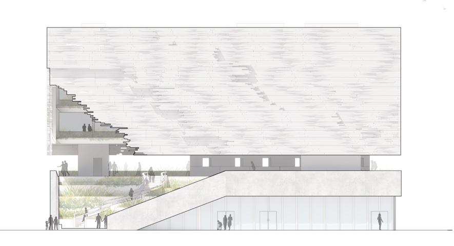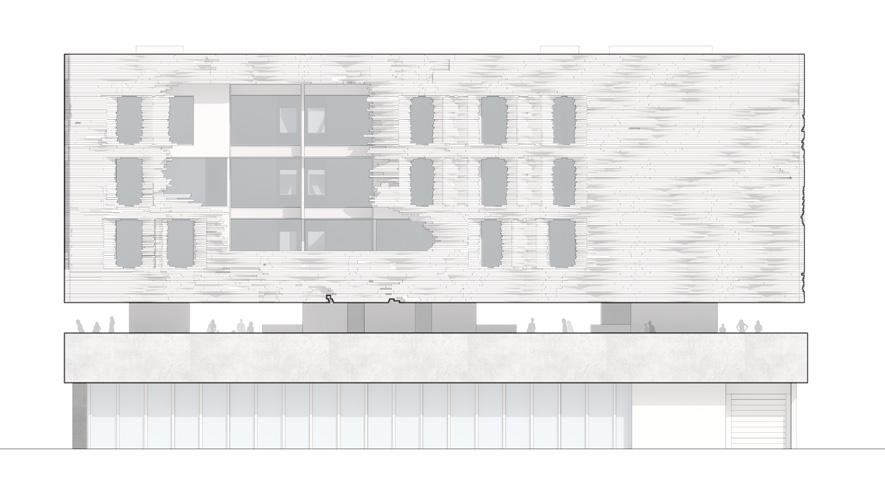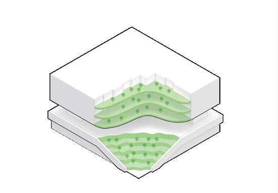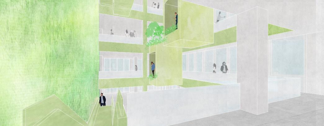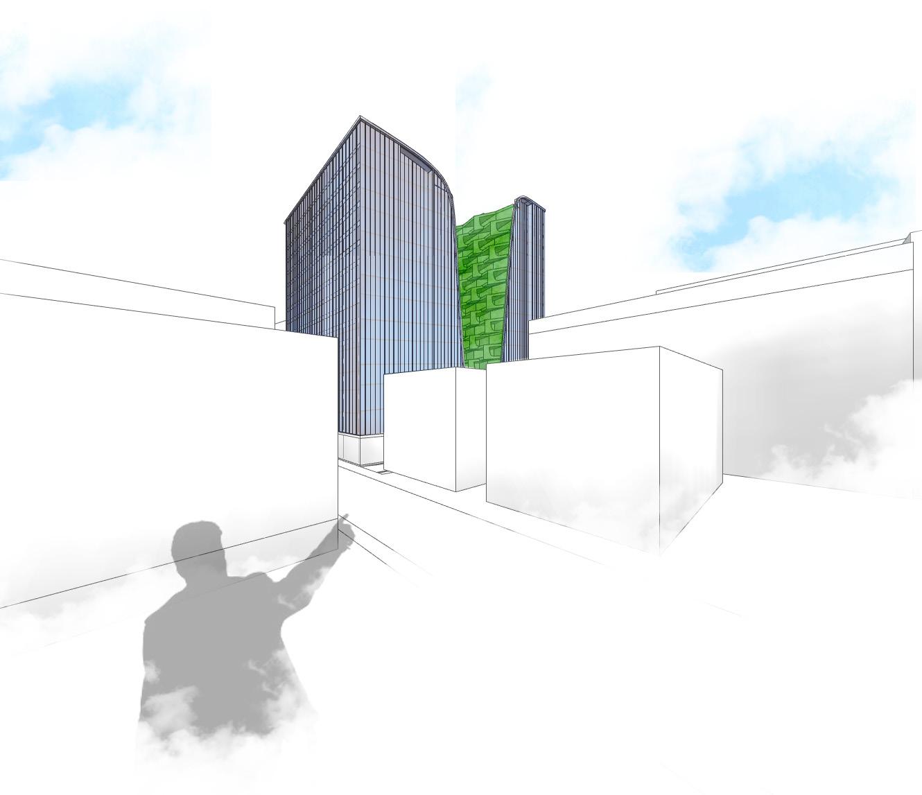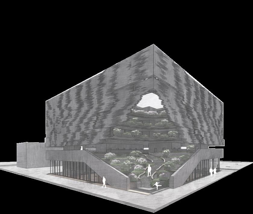 This theme is continued throughout the building in the facade as it wraps around and erodes at various points. It indicates openings, entries, and the point between the street corner and OASIS. Vegetation and greenery are integrated to further compliment the organic forms created through erosion
