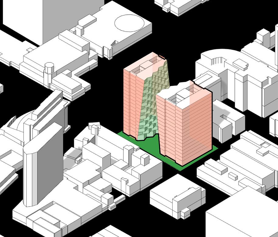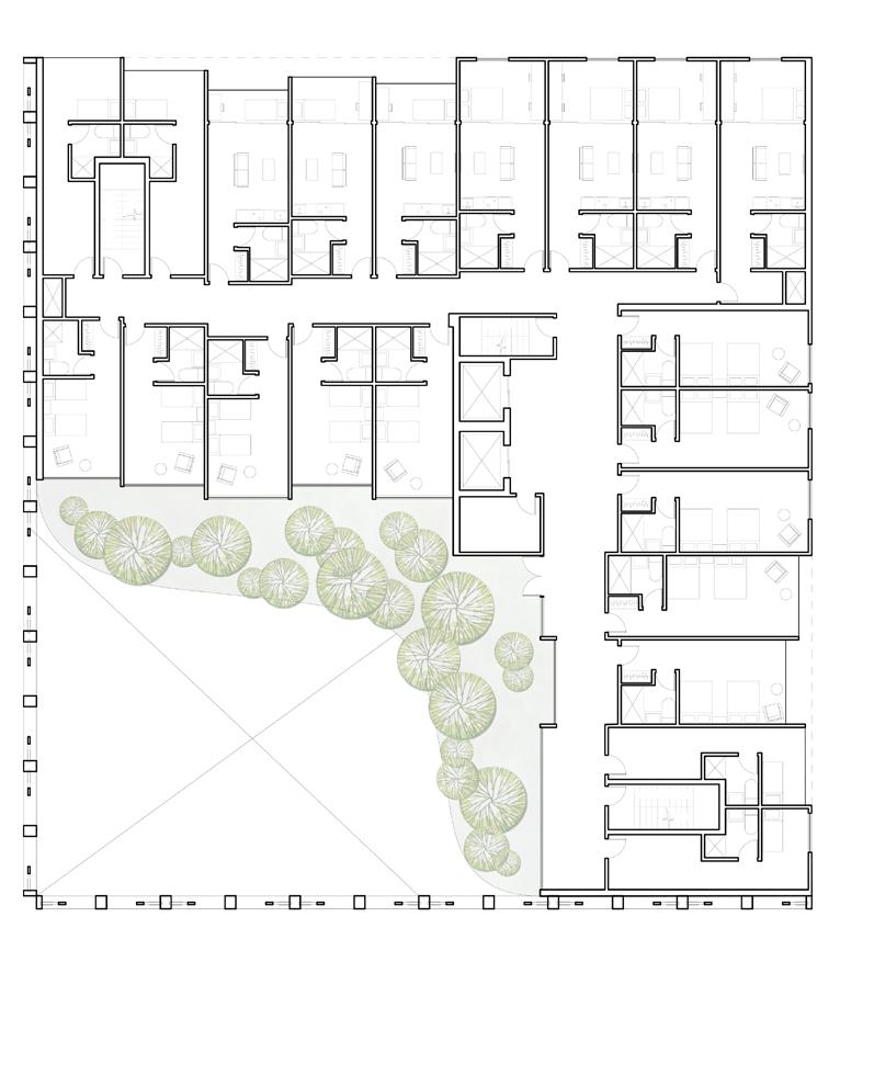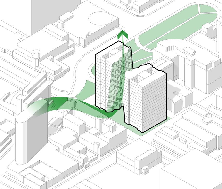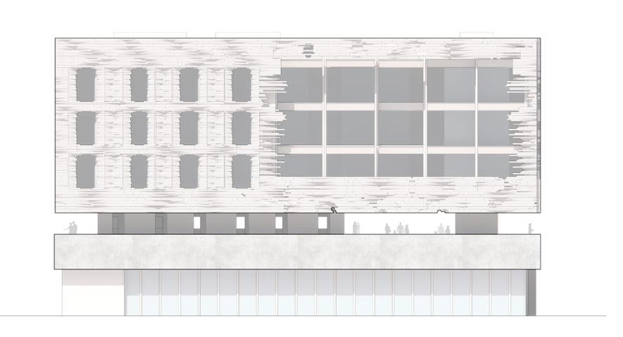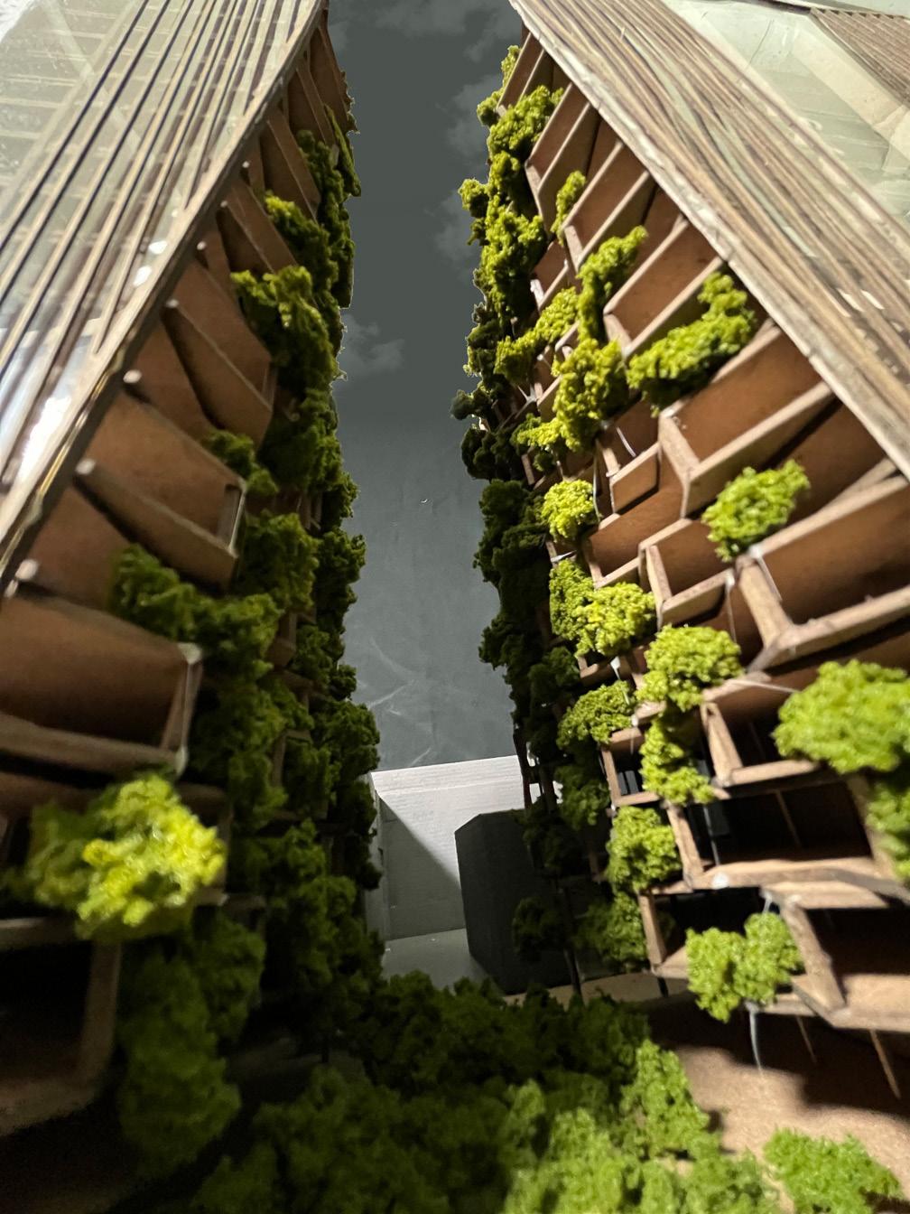 This theme is continued throughout the building in the facade as it wraps around and erodes at various points. It indicates openings, entries, and the point between the street corner and OASIS. Vegetation and greenery are integrated to further compliment the organic forms created through erosion
