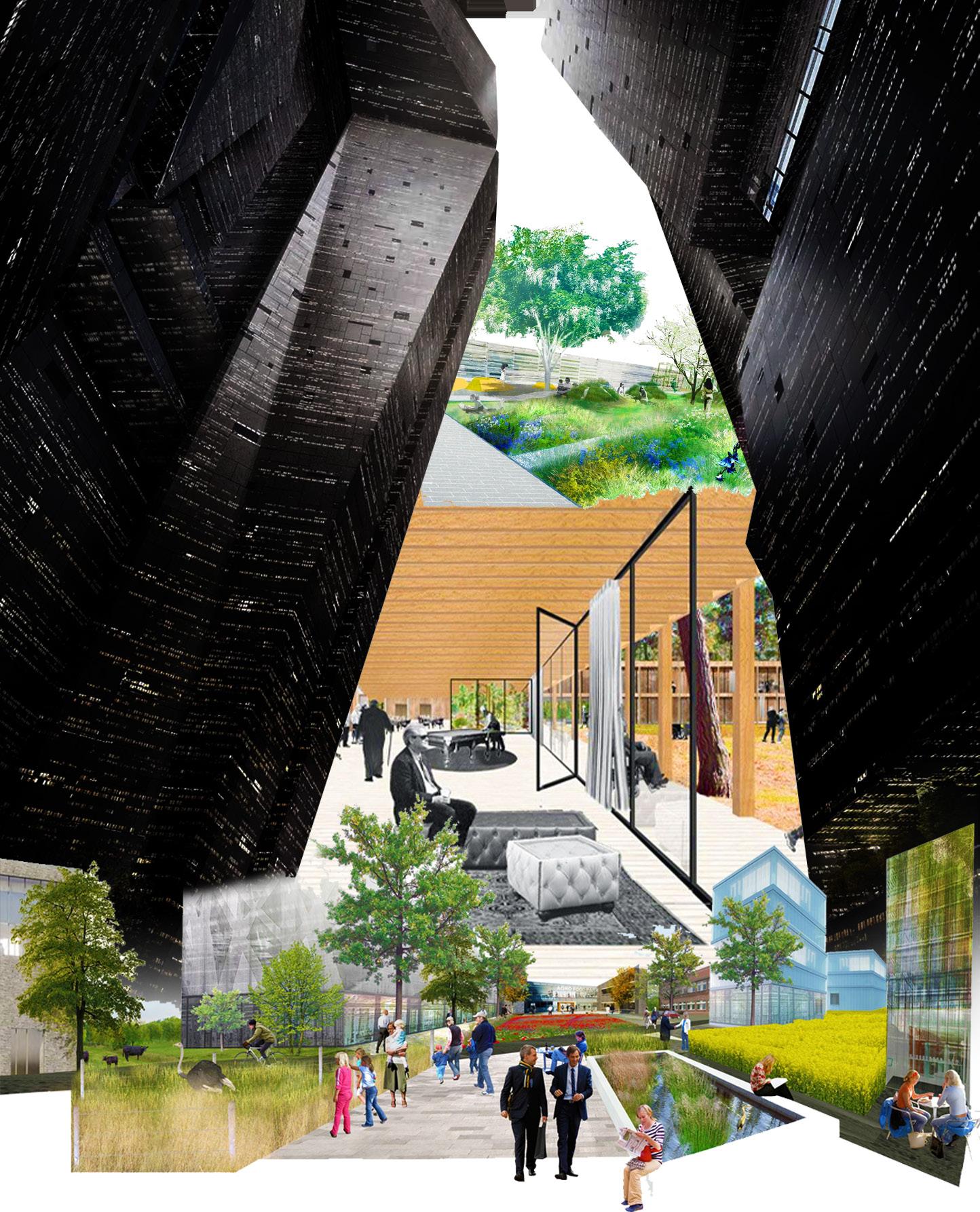 Conceptual collages provided a visually compelling way to summarize and communicate the key insights and themes that emerged from research of the office-park typology. Careful selection of images, textures, colors, and compositions that reflect conducted research establish the core concepts of the office-park typology. This process of visual translation/diagramming helped to further establish new connections and ideas while also serving as powerful tools for generating discussion and gathering additional input throughout the design process and reviews.