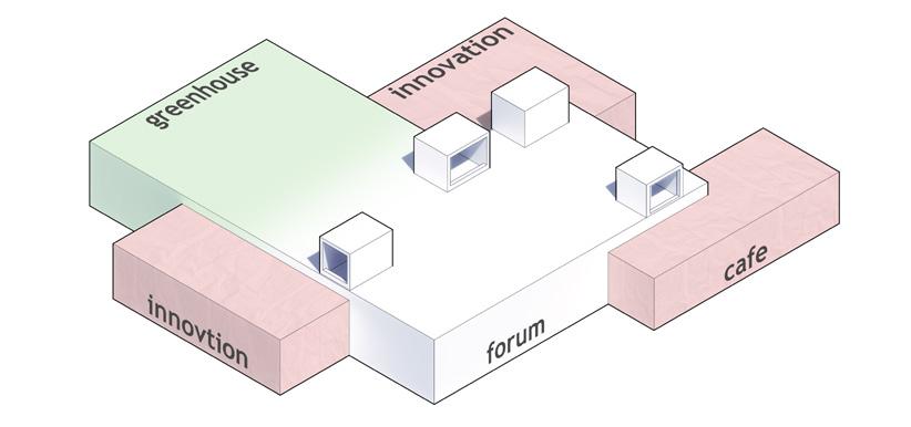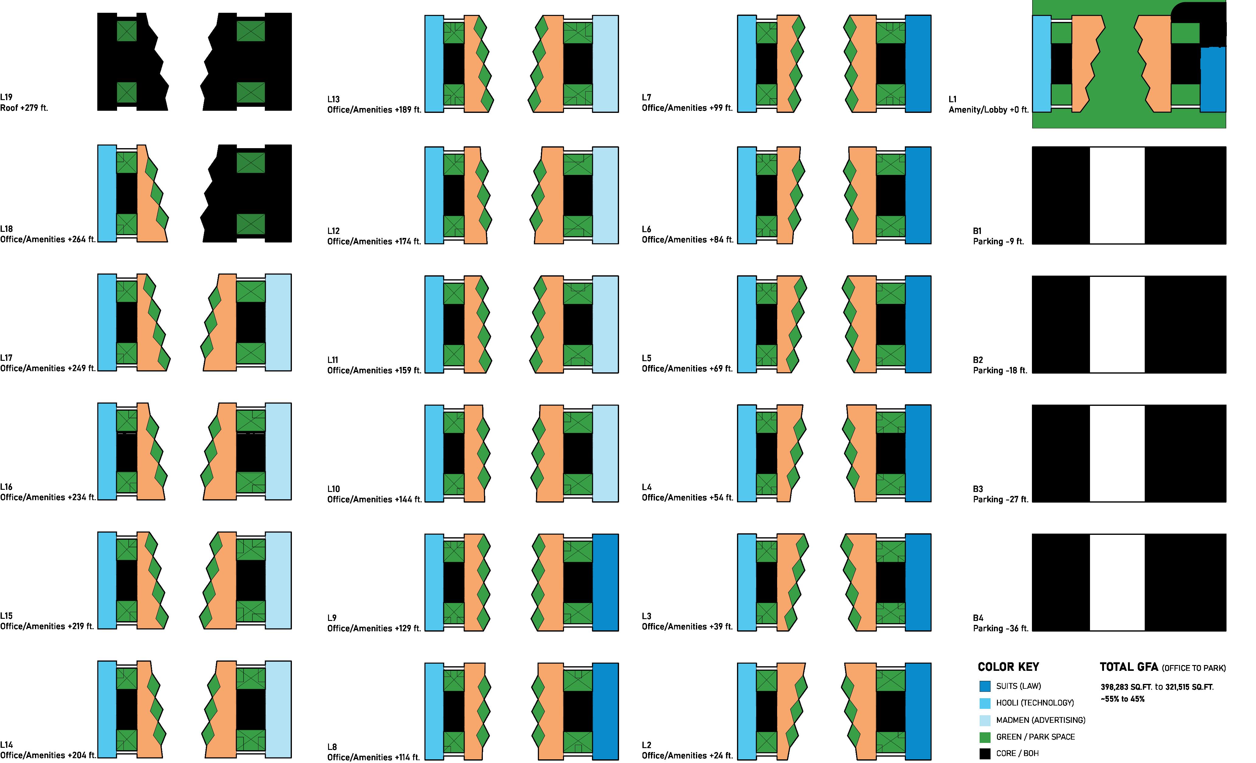 The overall conceptual exploration of officeparks inspired and informed design strategies/ diagramming. This further encouraged contextually aware solutions in response to evolving needs of the workplace.