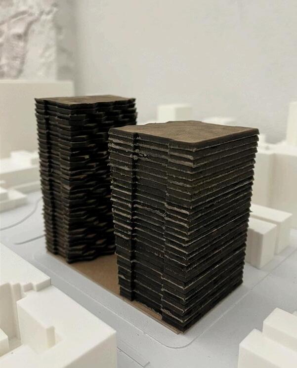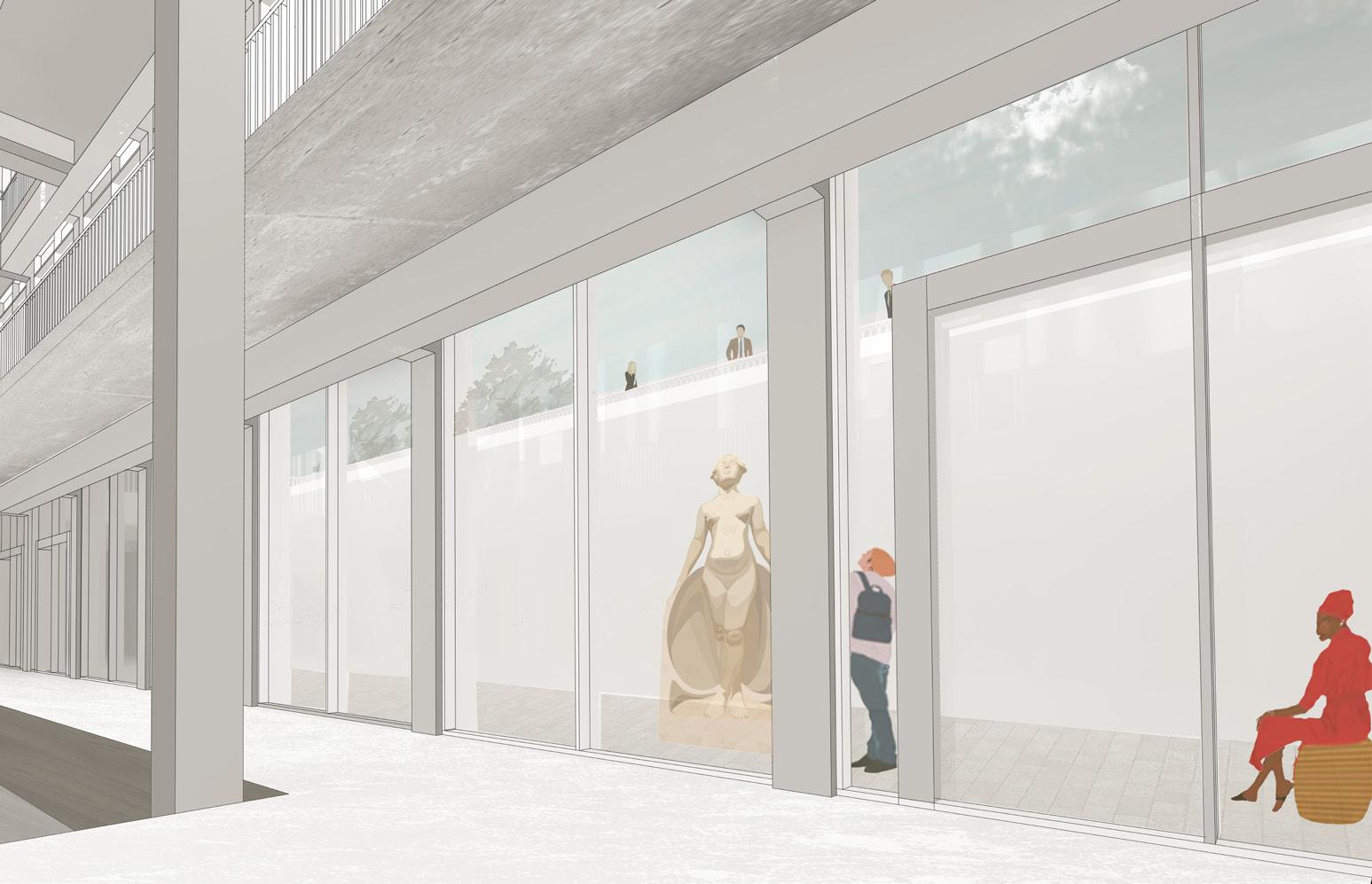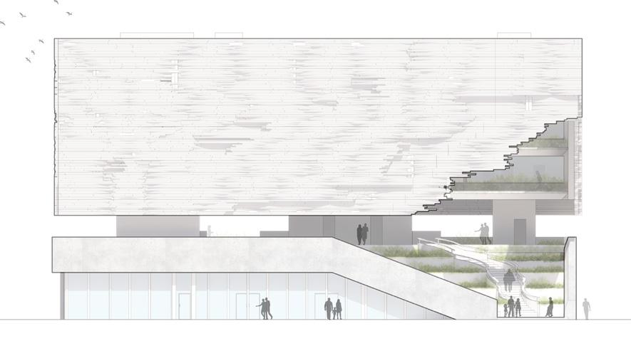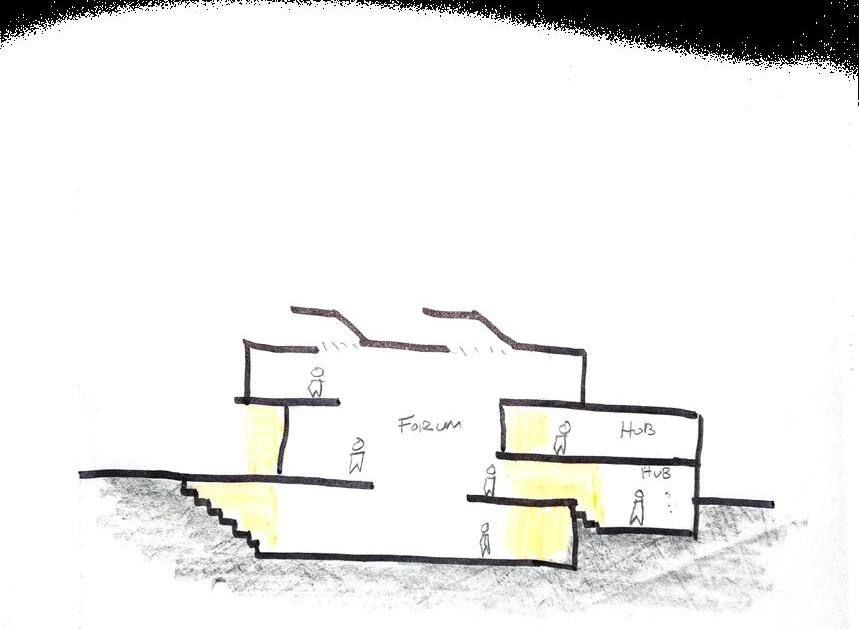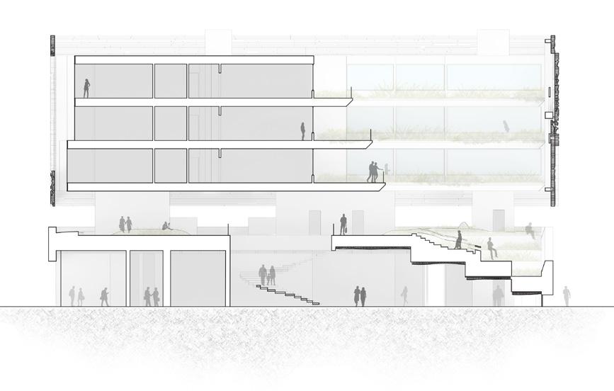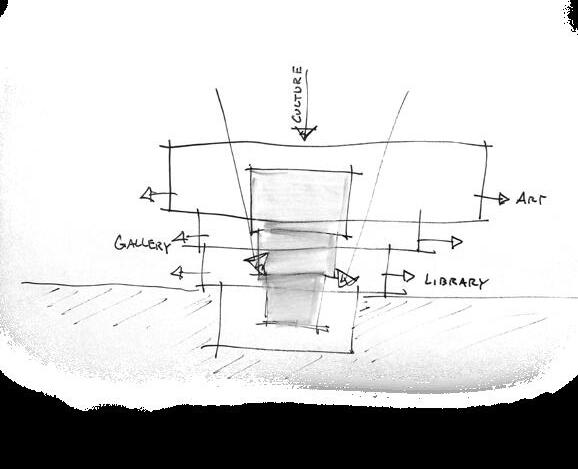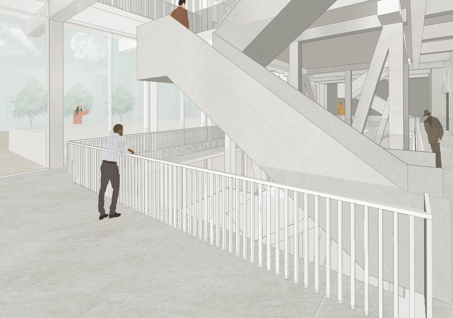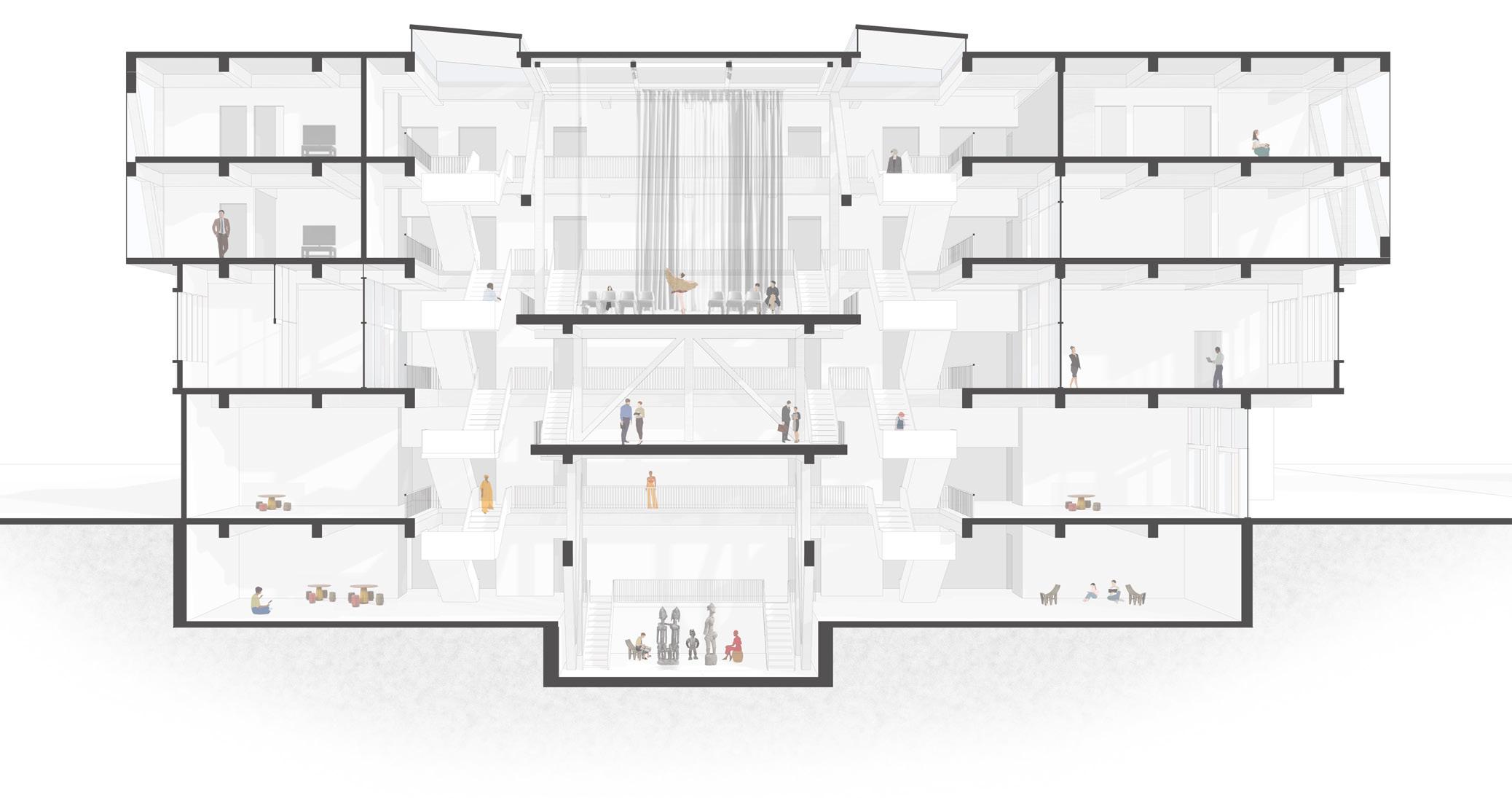 The interior quality reveals the openness between the different levels in order to emphasizes the vertical movement. Moreover, these transitory spaces surround the “cultural core” (voided, structurally exposed spaces with sunken floors that define spaces for large public gatherings) which establishes a connection between each individual level. Overall, the different aspects of the cultural hub are designed with sculpting in mind which extend to the sculpted form of the building to the gallery and theater activities that occur within.