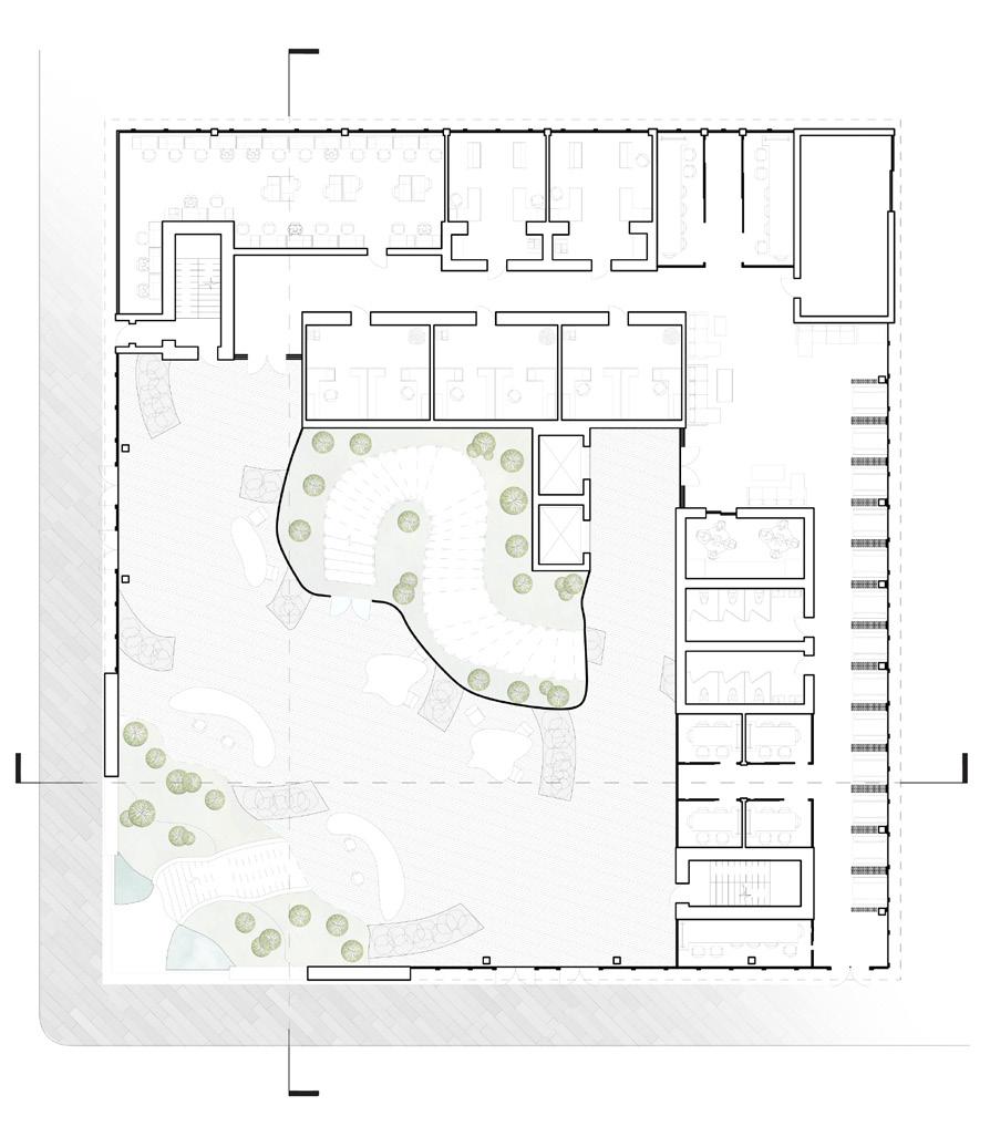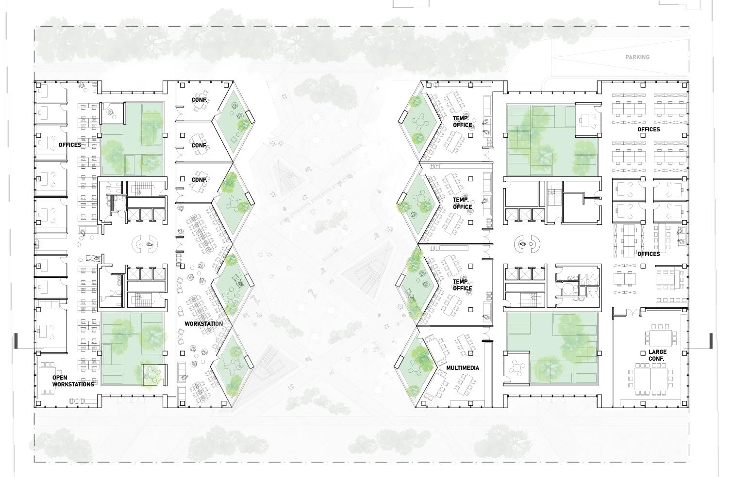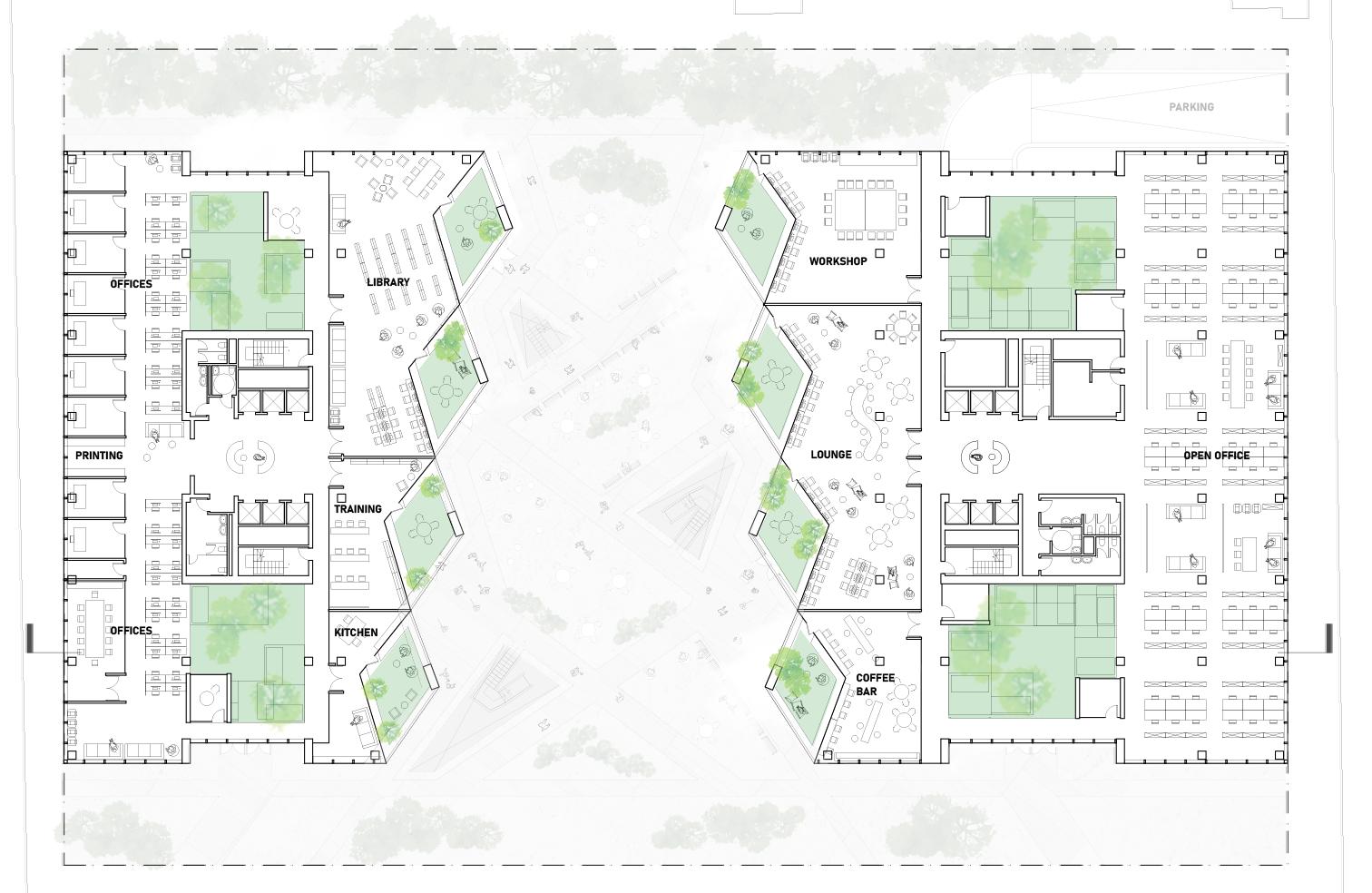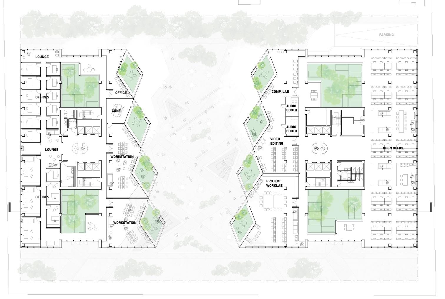 The offices have been programmed at the exteriors of the building. This establishes the interaction within the valley. This further encourages the movement between the offices to amenities to the park.