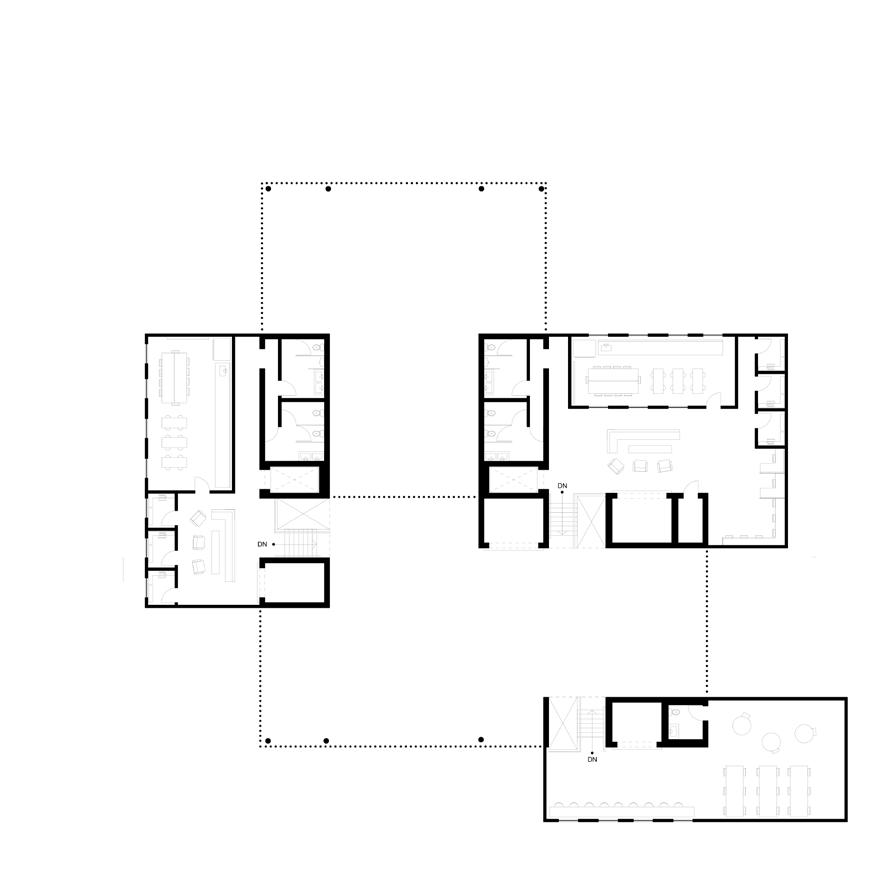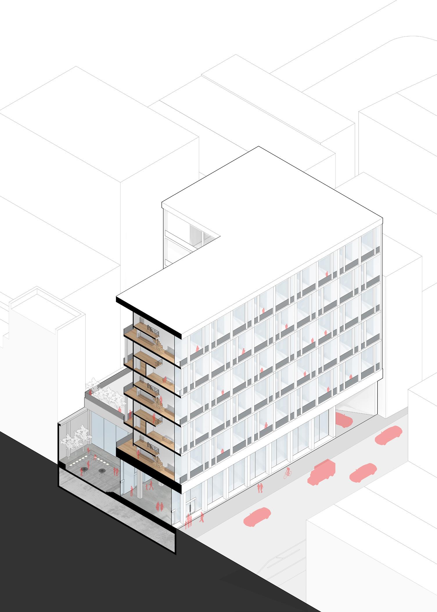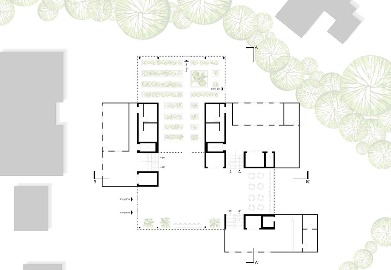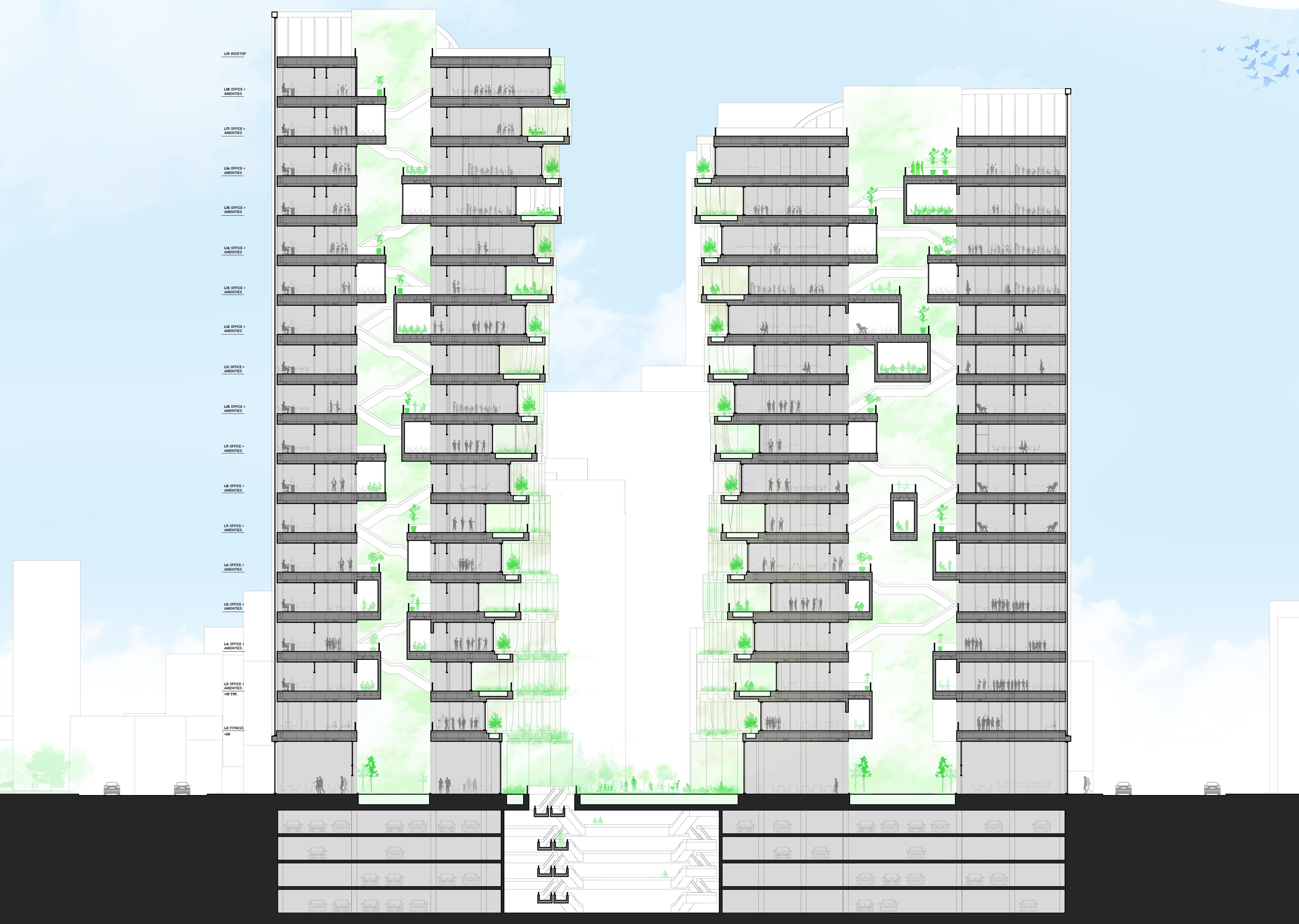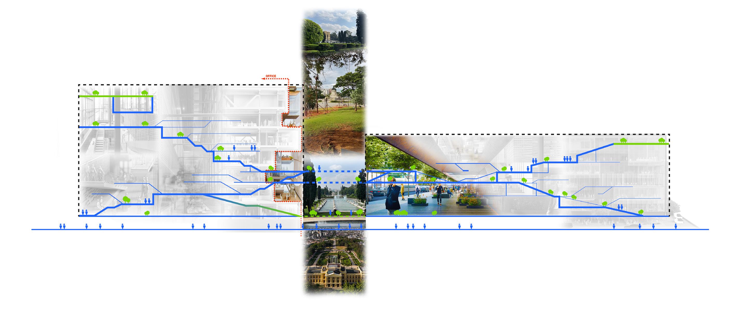 The offices have been programmed at the exteriors of the building. This establishes the interaction within the valley. This further encourages the movement between the offices to amenities to the park.