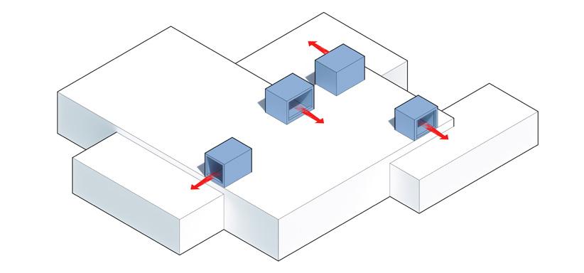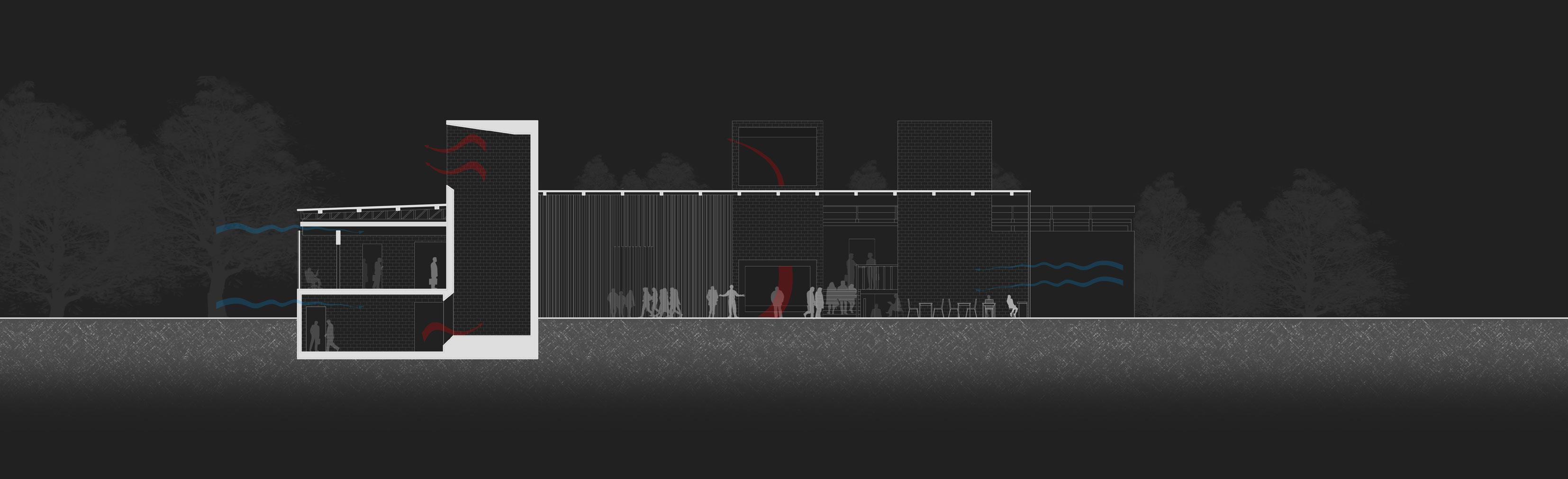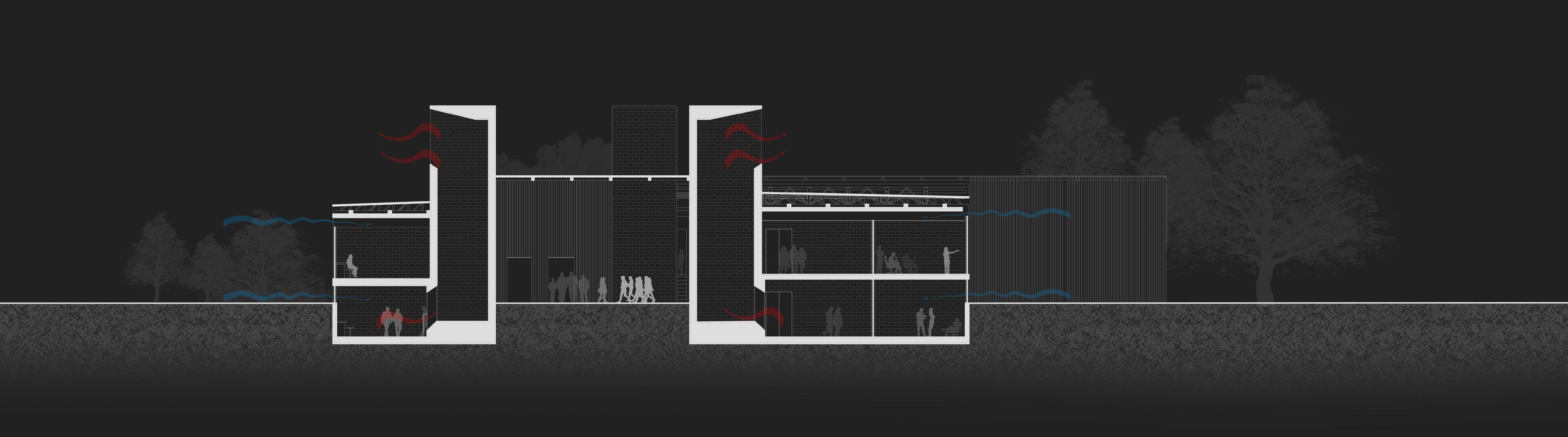In response to the climate, local techniques are utilized to prevent heat gains as well as light through perforations throughout the roof structure. Ventilation and concerns of wind are channeled through tall, large roof-protruding wind tunnels that service the different parts of the program. Hot air rises through wind tunnels. Meanwhile, the cool air sinks. The combination of these systems enable comfort and promote a center to house an extensive array of individuals.