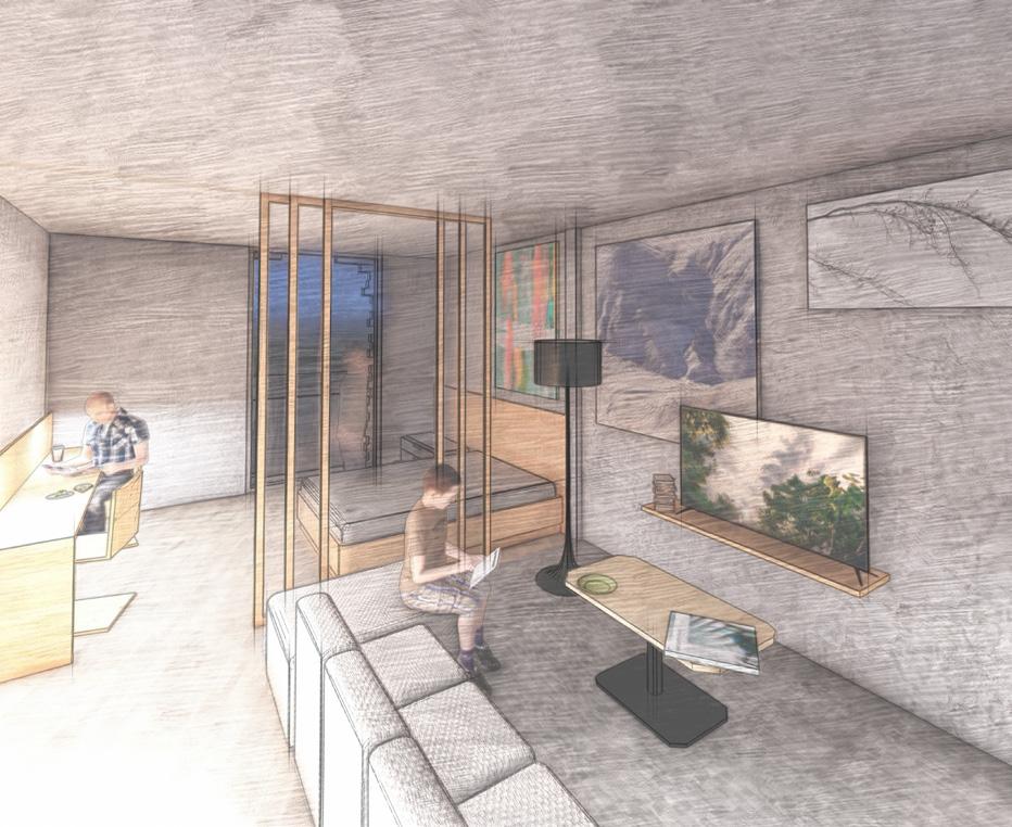 OASIS is heavily inspired by the theme of transience and permanence. The building represents a moment in one's journey through Oklahoma. It marks a place of stay for travelers and a place of congregation for the community. The 6-story building is separated into three programmatic levels. The first and second contain the co-working and food halls, respectively. Both are meant to temporary interactions. The levels beyond contain the hotel, with units ranging from 300 to 500 square feet, meant to become a place of extended stay.