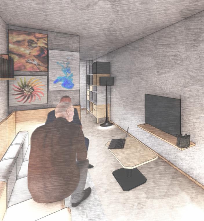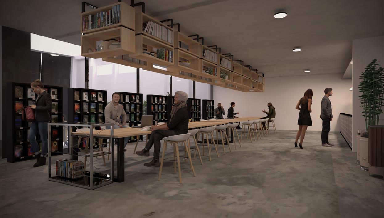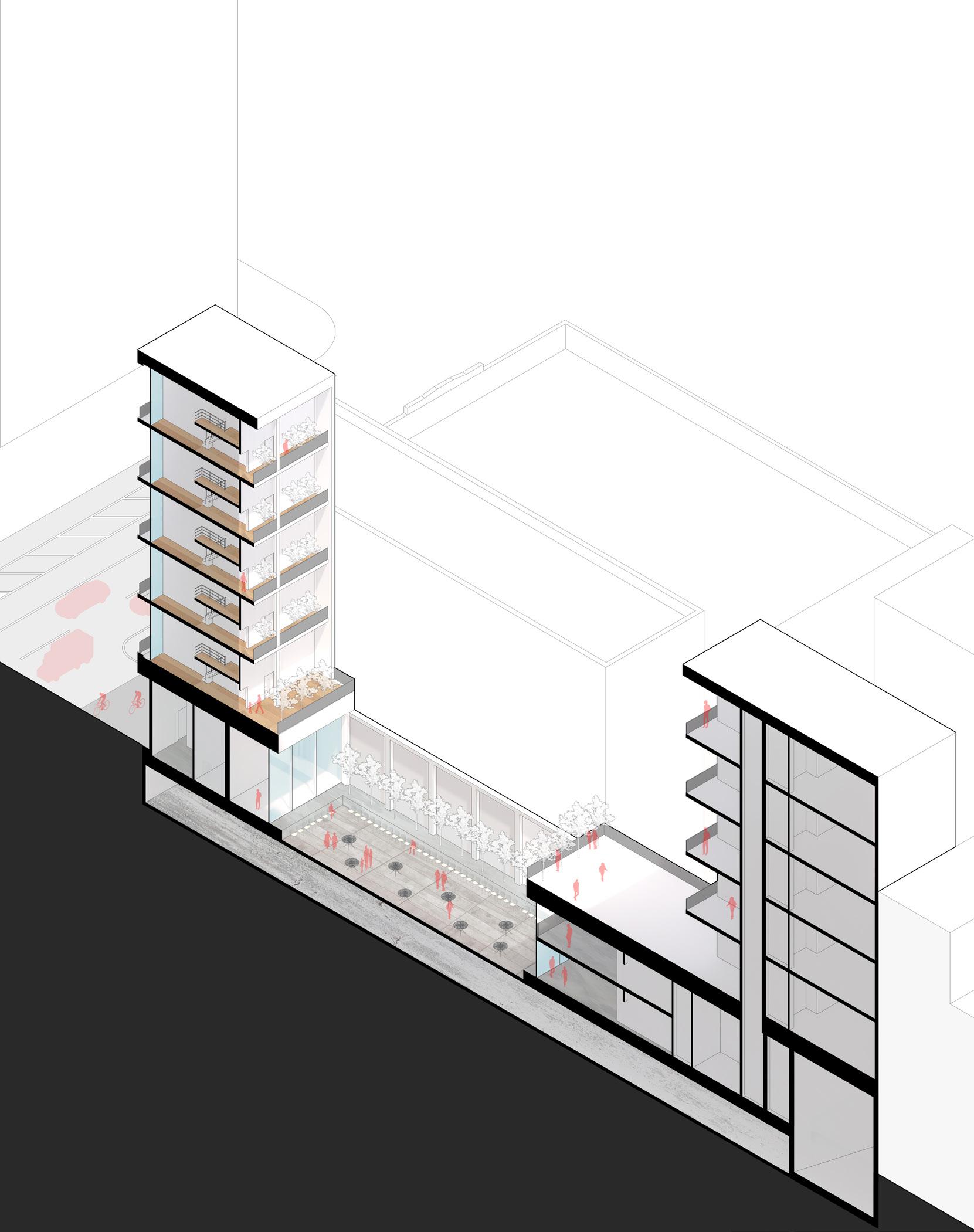 This creates a harmonious connection between the apartment complex and the surrounding environment. Beneath the collection of apartment units exists the bookstore cafe/ lobby for residents/ non-residents to congregate. It serves users by providing pedestrians with a place for rest from the streets of New York. It is a place for study, work, and interaction.