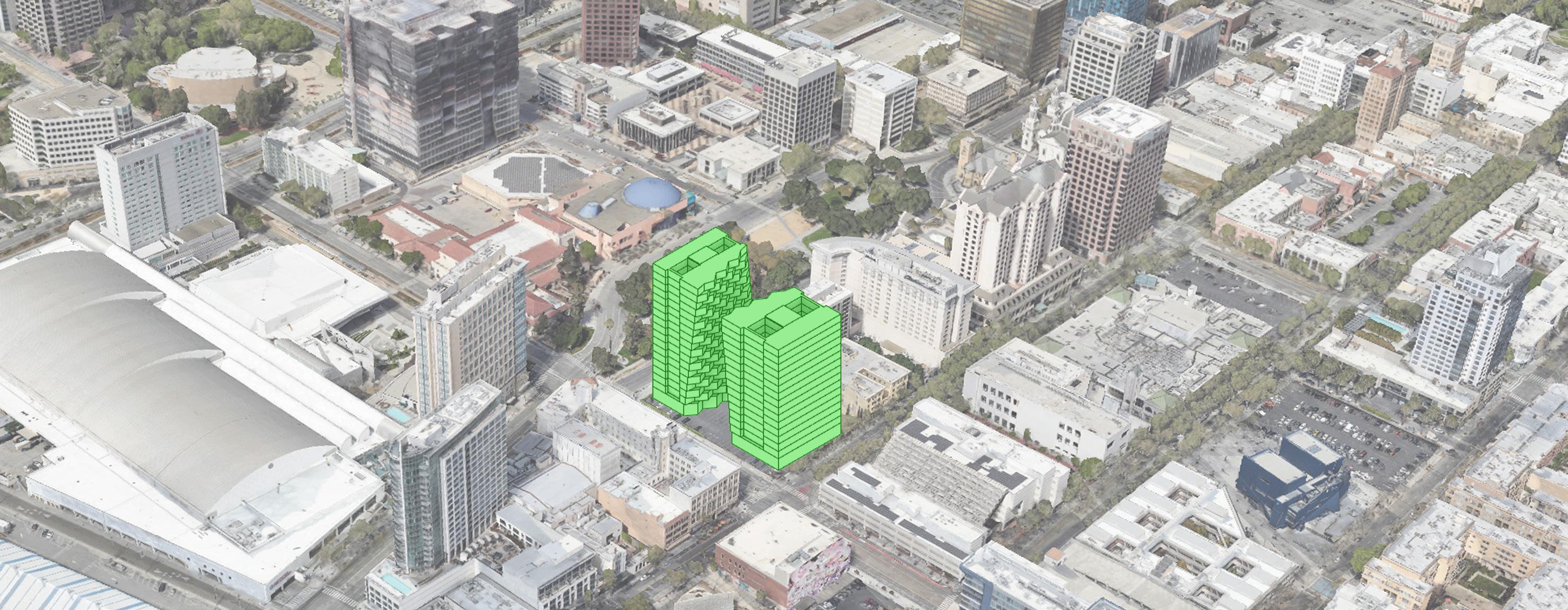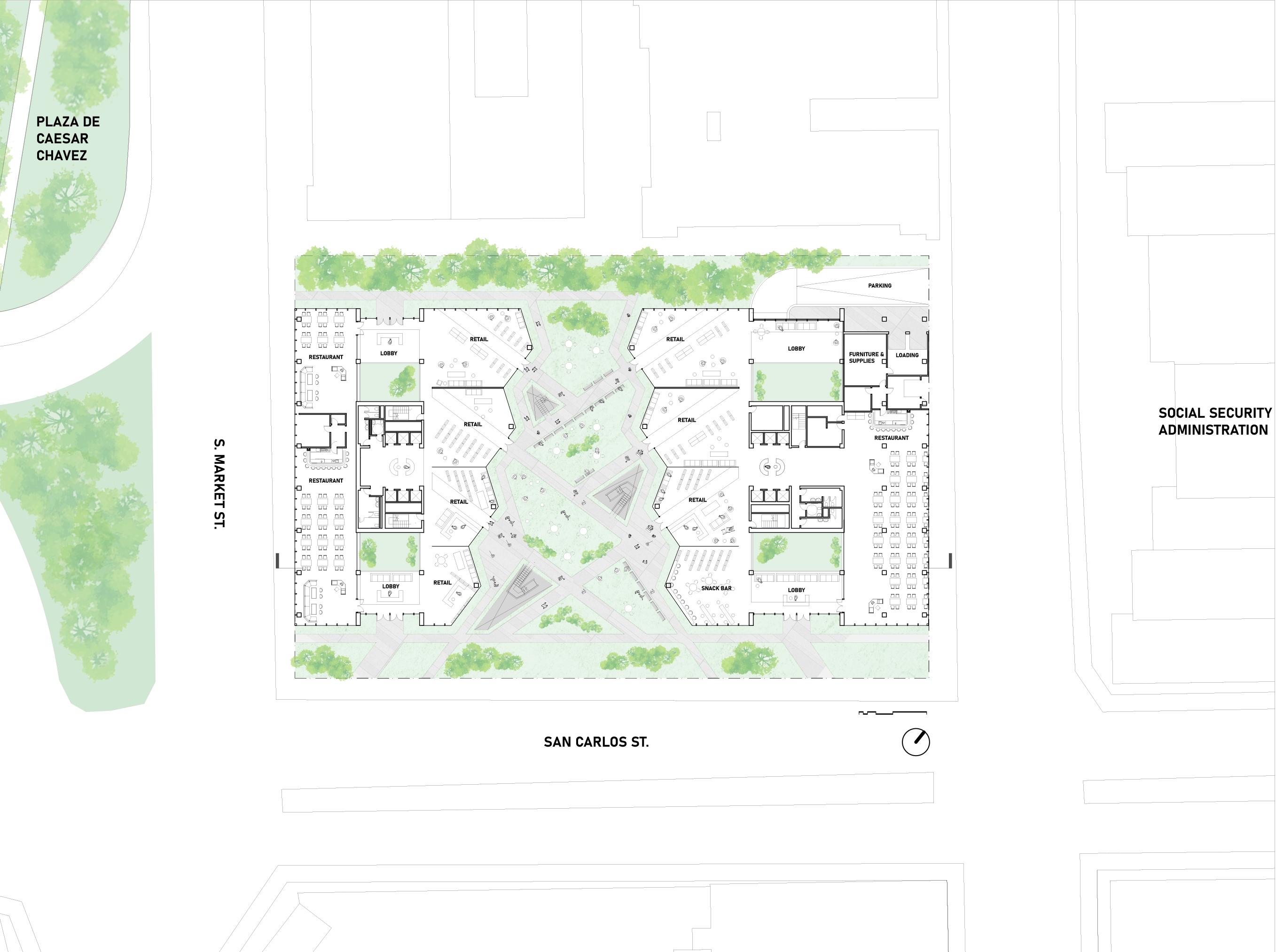 To the south is San Carlos Street, which accommodates vehicular traffic. To the west by South Market Street, vehicular traffic is also accommodated for. To the north exist adjacent properties. To the east, by South First Street, it supports both vehicular and light rail traffic.