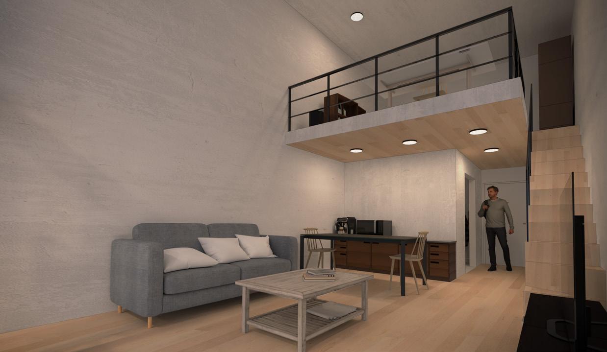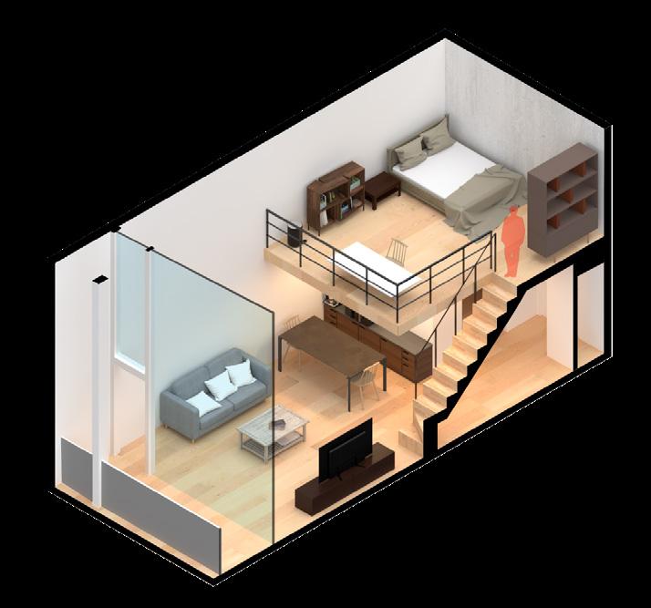 The apartment is a 10-storey tall complex reaching a height of 106 feet. The building footprint is dimensioned at 80 feet by 232 feet. The individual apartment units are dimensioned at 13 feet by 30 feet, allocating 390 square feet per unit. Each unit utilizes a double-height to distinguish between living/dining and study/rest. Additionally, each unit aligns itself creating a simple unique facade that draws inspirations from the local architecture.