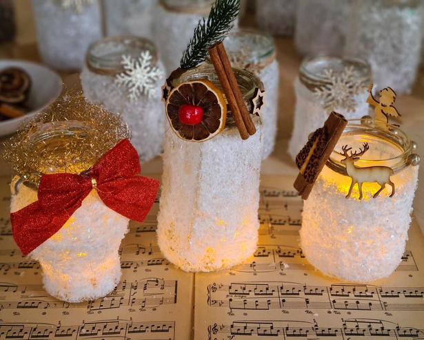 Ciemności, które nam zapodaje zima, trzeba rozpraszać... Czym? Najlepiej lampionami! Najlepiej własnej roboty:) słoik, sól gruboziarnista, klej Wikol, pędzel lub gąbka, świeczka (podgrzewacz), sznurek jutowy, gałązki choinki, szyszki, wysuszone pomarańcze, małe bombki, suszone pomarańcze, laski wanilii – czym tylko chcemy udekorować nasz lampion.