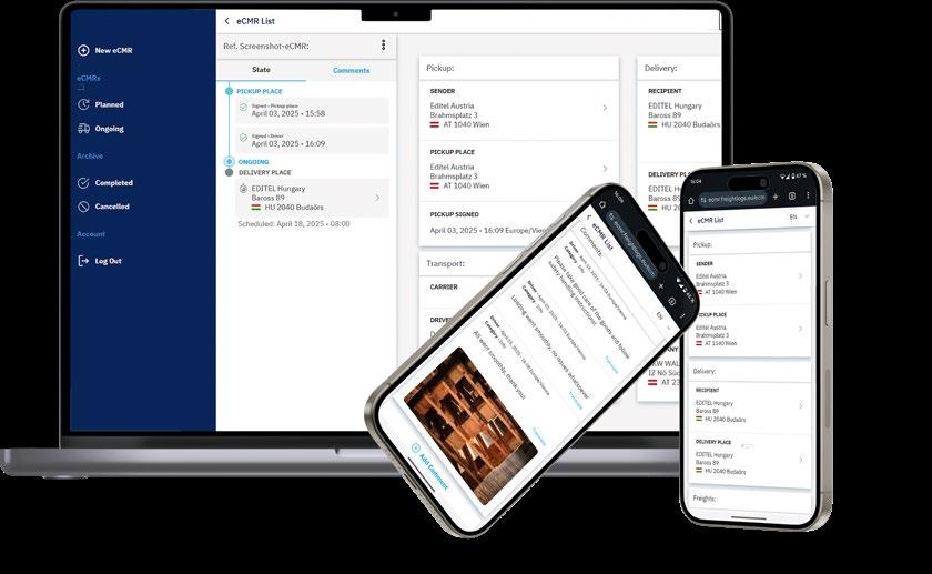 eCMR: nový štandard v logistike eCMR je moderná náhrada papierových medzinárodných nákladných listov – vystavený online, digitálne podpísaný na mobile či tablete, dostupný kedykoľvek a kdekoľvek všetkým zúčastneným stranám. Už dnes je právne uznávaný v 38 krajinách vrátane Slovenska.