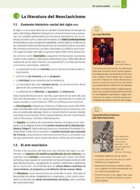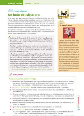 «Punto de lectura»: la sección dedicada a la literatura se cierra con la lectura de un fragmento literario de autores clásicos que el alumnado tendrá que leer, comprender y analizar, para completar de esta manera su acercamiento al periodo literario que ha estudiado. Además, como complemento, en la zona de recursos de la web de Editex podrá acceder a la videoguía de una película relacionada con lo trabajado en la unidad.