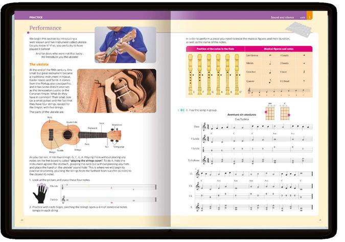 • Scores for all the musical activities for the instruments normally available in the classroom and the usual range of voices are provided. In addition, the ukelele is incorporated into the performance activities.