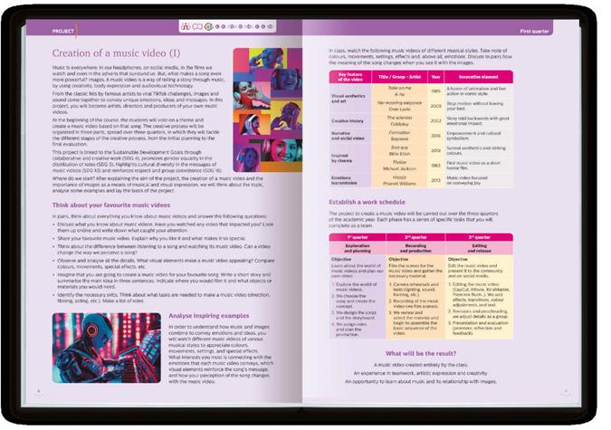 Each book is based on a global project (MUSIC I: “Creation of a music video”; MUSIC II: “Fashion show”), which will be developed step by step, in four stages, throughout the academic year and will turn each student into the main character of their own learning process with an active methodology based on research, thinking and cooperation, where they will learn to take on different roles and responsibilities.