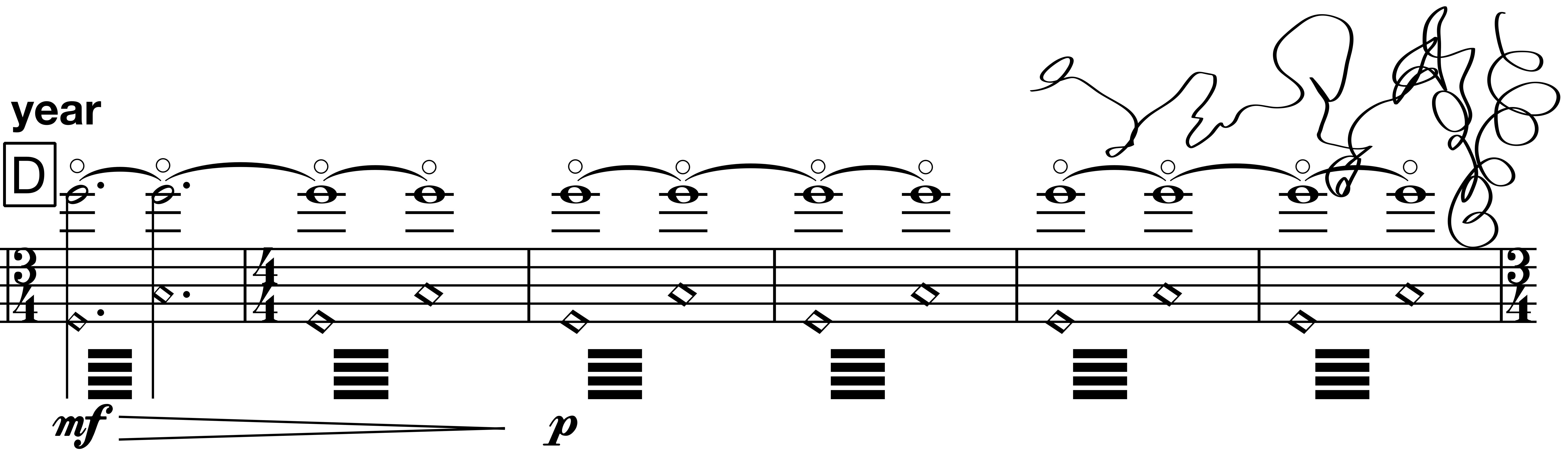 Throughout long passages of the piece, the player is asked to add voice to their playing, and to move it in a wave-like manner. Use the vocal pitch given in the octave that feels most comfortable for you and move it in the way you interpret the graphics.