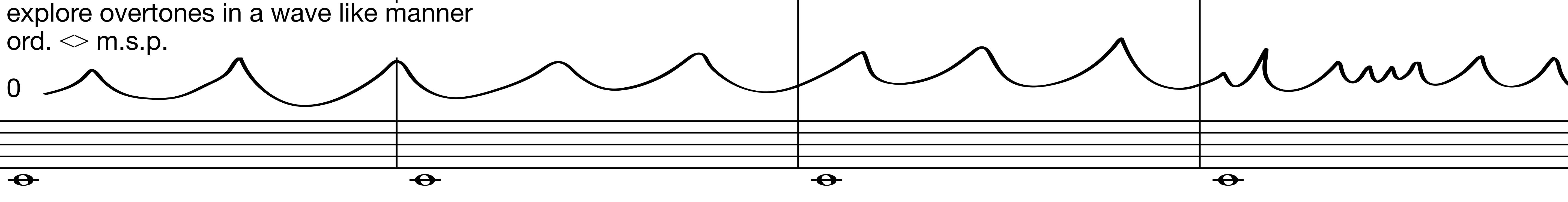 The score uses graphics to better describe the piece’s soundscape. The graphics can be anything from subtle wavy lines to something absolutely all over the place. Sometimes depicting a slow bending of the tone. Sometimes a rather exaggerated vibrato. Sometimes a more extreme glissing back and forth Sometimes glissing while rattling with the pitch. Ex: