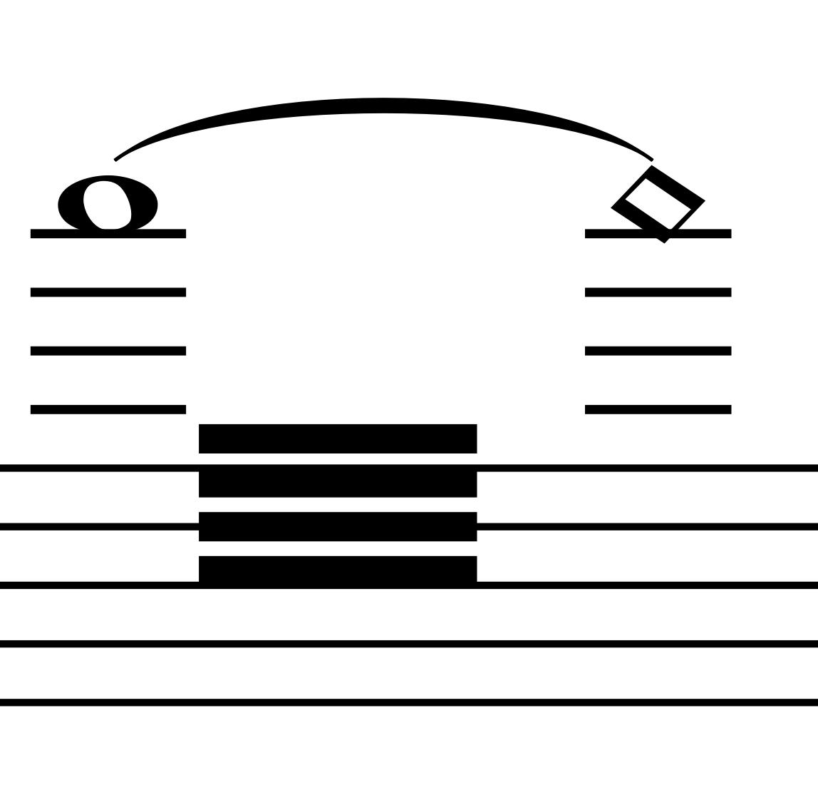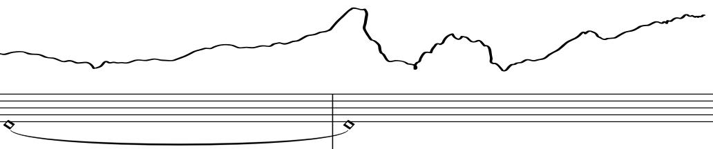 Two timpani are used, ca. 26′ and 32′. A good deal of tuning (or detuning if you will) takes place throughout the piece. For clarity, the part has thus been divided into two staves; one to depict the tuning and one for what is to be performed on the skins. The tuning action is depicted with graphics, like so: