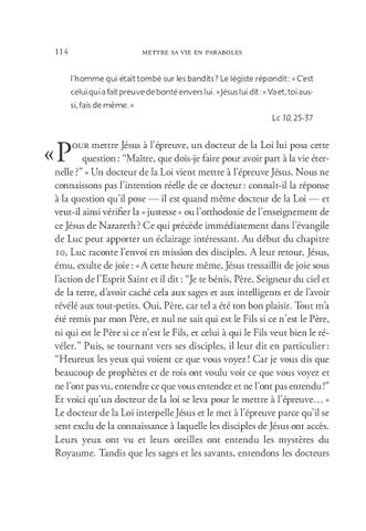 our mettre Jésus à l’épreuve, un docteur de la Loi lui posa cette question : “Maître, que dois-je faire pour avoir part à la vie éternelle ?” » Un docteur de la Loi vient mettre à l’épreuve Jésus. Nous ne connaissons pas l’intention réelle de ce docteur : connaît-il la réponse à la question qu’il pose — il est quand même docteur de la Loi — et veut-il ainsi vérifier la « justesse » ou l’orthodoxie de l’enseignement de ce Jésus de Nazareth ? Ce qui précède immédiatement dans l’évangile de Luc peut apporter un éclairage intéressant. Au début du chapitre 10, Luc raconte l’envoi en mission des disciples. A leur retour, Jésus, ému, exulte de joie : « A cette heure même, Jésus tressaillit de joie sous l’action de l’Esprit Saint et il dit : “Je te bénis, Père, Seigneur du ciel et de la terre, d’avoir caché cela aux sages et aux intelligents et de l’avoir révélé aux tout-petits. Oui, Père, car tel a été ton bon plaisir. Tout m’a été remis par mon Père, et nul ne sait qui est le Fils si ce n’est le Père, ni qui est le Père si ce n’est le Fils, et celui à qui le Fils veut bien le révéler.” Puis, se tournant vers ses disciples, il leur dit en particulier : “Heureux les yeux qui voient ce que vous voyez ! Car je vous dis que beaucoup de prophètes et de rois ont voulu voir ce que vous voyez et ne l’ont pas vu, entendre ce que vous entendez et ne l’ont pas entendu !” Et voici qu’un docteur de la loi se leva pour le mettre à l’épreuve… » Le docteur de la Loi interpelle Jésus et le met à l’épreuve parce qu’il se sent exclu de la connaissance à laquelle les disciples de Jésus ont accès. Leurs yeux ont vu et leurs oreilles ont entendu les mystères du Royaume. Tandis que les sages et les savants, entendons les docteurs