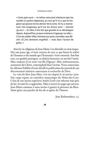 Ainsi la vie religieuse de Jean-Marie s’est déroulée en trois étapes. Dès son jeune âge, il était curieux de tout ce qui faisait la réalité de l’homme et du monde que l’humanité s’était construit. Son bon sens, ses qualités pratiques, sa chaleur humaine en ont fait l’unité. Mais toujours il est resté vrai fils d’Ignace : libre intérieurement, amoureux du Christ, contemplatif dans l’action. Nous remercions les éditions Fidélité d’avoir décidé la publication du journal de son discernement intérieur concernant sa recherche de Dieu. La voix du frère Jean-Marc s’est tue depuis le 16 janvier 2010. Son corps repose au cimetière monastique du Mont-des-Cats. Celui de son ancien supérieur André Louf a été inhumé tout près de lui ; la mort les a rapprochés. Mais à travers les pages qui suivent, Jean-Marie continue à nous inviter à goûter la présence du BienAimé grâce aux paroles de feu de sa quête de l’Amour. Jean Radermakers, s.j.