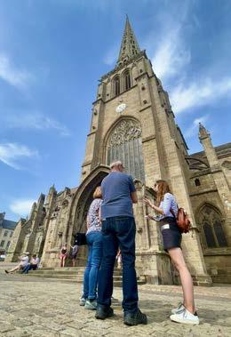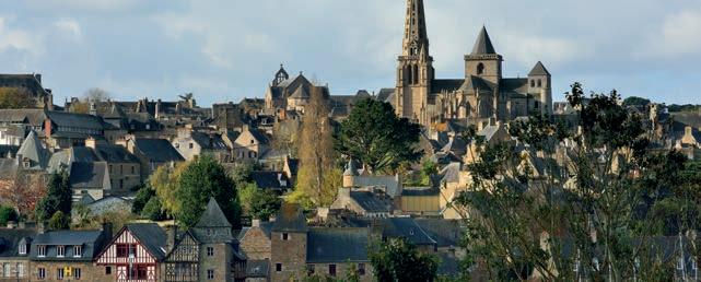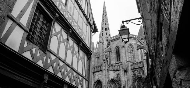 Majestueuse, elle est le centre de toutes les attentions et bientôt de la vôtre. Il vous faudra monter jusqu’au centre-ville, par d'étroites ruelles pavées, bordées de maisons à pans de bois où les artisans d’art vous ouvrent leurs portes bien volontiers. Elle se découvre enfin imposante avec son cloître, l'un des plus beaux de Bretagne, havre de silence au milieu de cette place fourmillante de piétons, de terrasses et de camelots du marché le mercredi. Plus tard ce même jour, les notes de musique rebondiront sur les façades à colombages. Promesse d’une nuit chaude où la bière locale produite dans la brasserie (à visiter) à quelques pas d’ici coulera un peu plus que d’habitude, trônant sur les tables des nombreuses terrasses.