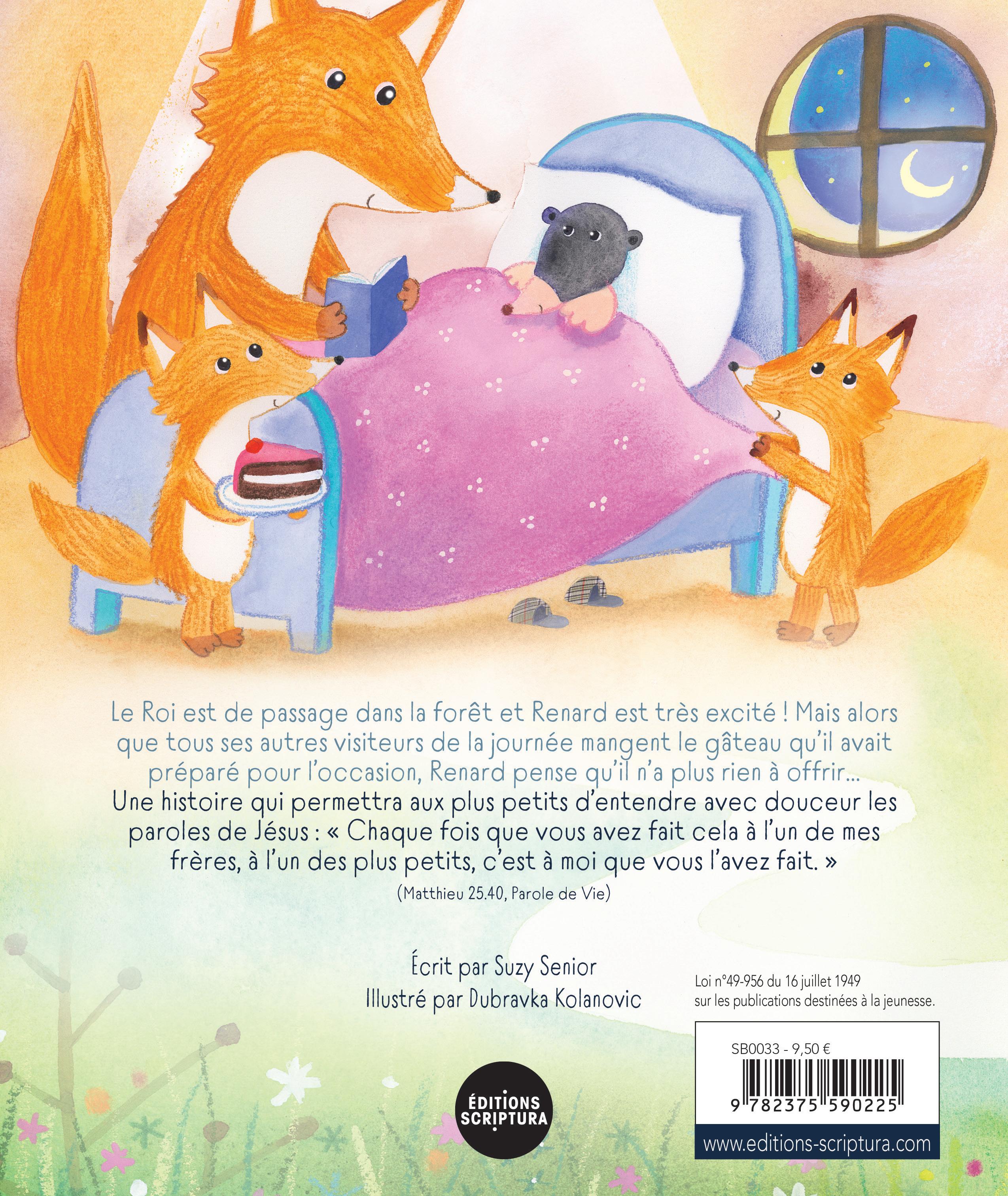 Ce livre s’inspire d’une histoire que Jésus raconte dans la Bible. Tu peux la trouver dans l’évangile de Matthieu au chapitre 25, les versets 34 à 40 (il n’y a pas de renards dans la version originale – et le roi est un peu différent). Jésus nous dit que toutes les fois que nous faisons du bien à quelqu’un d’autre, nous le faisons en réalité À DIEU.