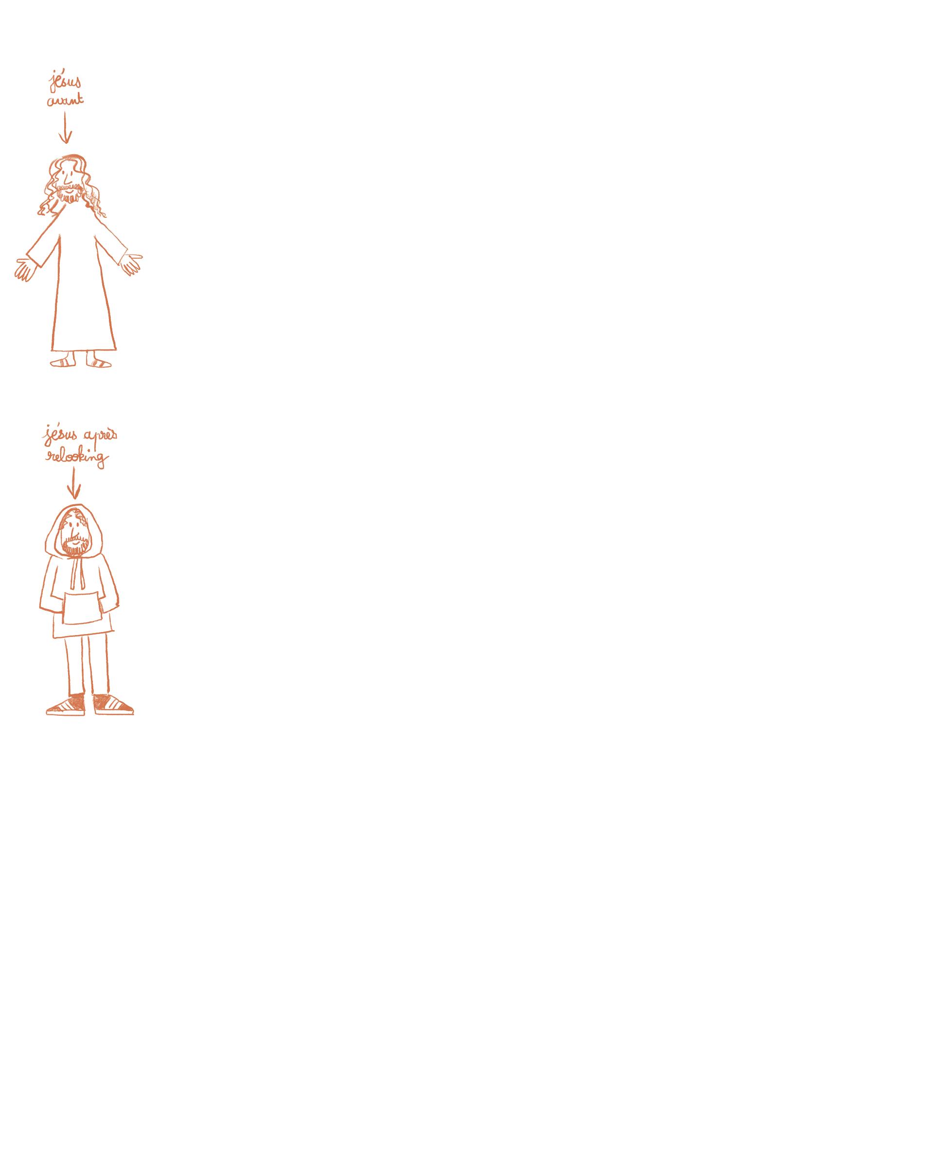 « Petite Pomme, tu crois que je peux aller à l’école habillé comme ça ? » « À mon école ? Ouuuh là non, Jésus ! Non, ton style ne va pas du tout. Je t’amène un jeans et un pull à capuche de mon papa. Va falloir te coiffer aussi, sinon Maman ne te laissera pas sortir. Pour la barbe, c’est super cool, c’est trop à la mode pour l’instant. Par contre, les sandalettes ça le fait pas, mets au moins