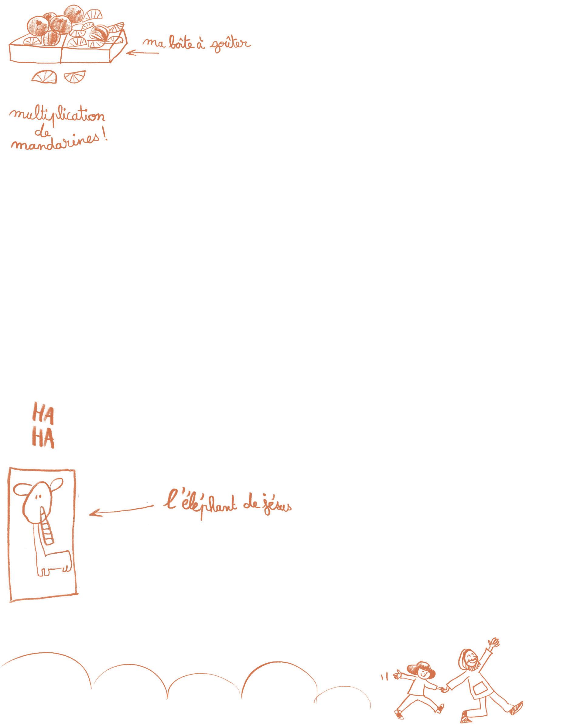 Voir Jésus, Maman, c’était tellement génial que je suis restée assise sur le bord du terrain pour l’observer. À la récré, tous les enfants sont venus lui dire des trucs, il m’a murmuré : « Petite Pomme, tu as encore une mandarine ? » Je lui ai donné tout ce que j’avais. Il a commencé à peler la mandarine et à donner des morceaux à mes amis. Et là, je n’ai plus rien compris. Au dixième quart de mandarine qu’il sortait, j’ai arrêté de compter. À la fin, il m’a rendu ma boîte à goûter. Eh bien, j’ai eu du mal à la fermer parce qu’elle débordait de morceaux de mandarine.