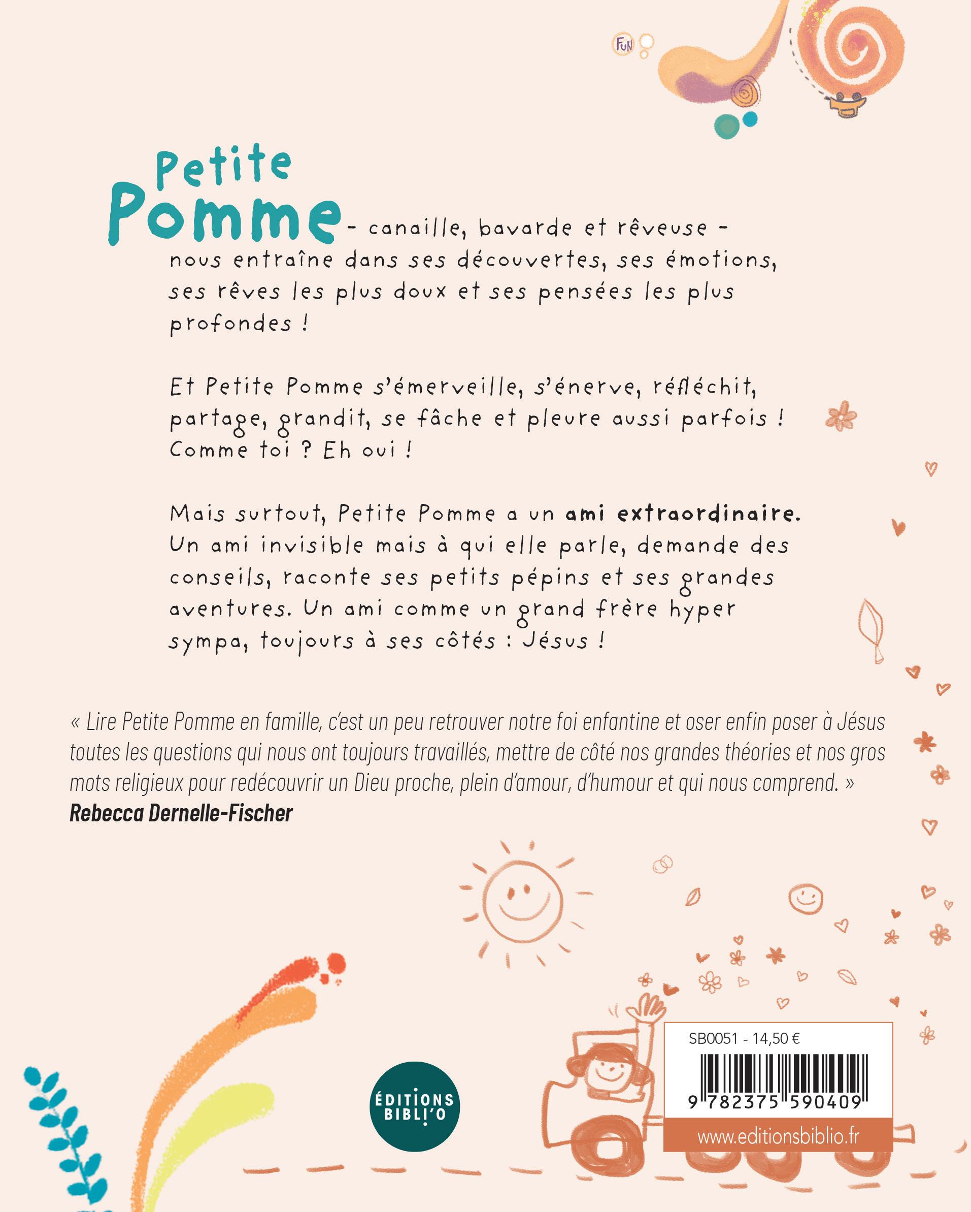 Bienvenue dans les aventures de Petite Pomme et de son ami extraordinaire, Jésus. Ce livre se compose de quelques histoires plus ou moins longues, au ton léger et rigolo, mais dont le contenu est proche du vécu et du monde émotionnel de nos enfants. Petite Pomme est une grande philosophe haute comme trois pommes qui n’hésite pas à chambouler notre manière de communiquer avec Dieu. L’écouter papoter, c’est nous demander si nous n’avons pas oublié comment nous adresser avec simplicité à Jésus. Comme si nous avions appris en chemin trop de « gros mots religieux ». Ces pages nous donnent envie de lui parler comme s’il était tout proche à chaque instant, comme s’il était notre ami. Et Petite Pomme nous rappelle justement combien cela est vrai.