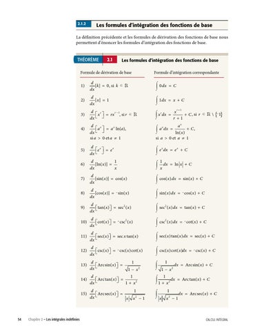 La définition précédente et les formules de dérivation des fonctions de base nous permettent d’énoncer les formules d’intégration des fonctions de base.