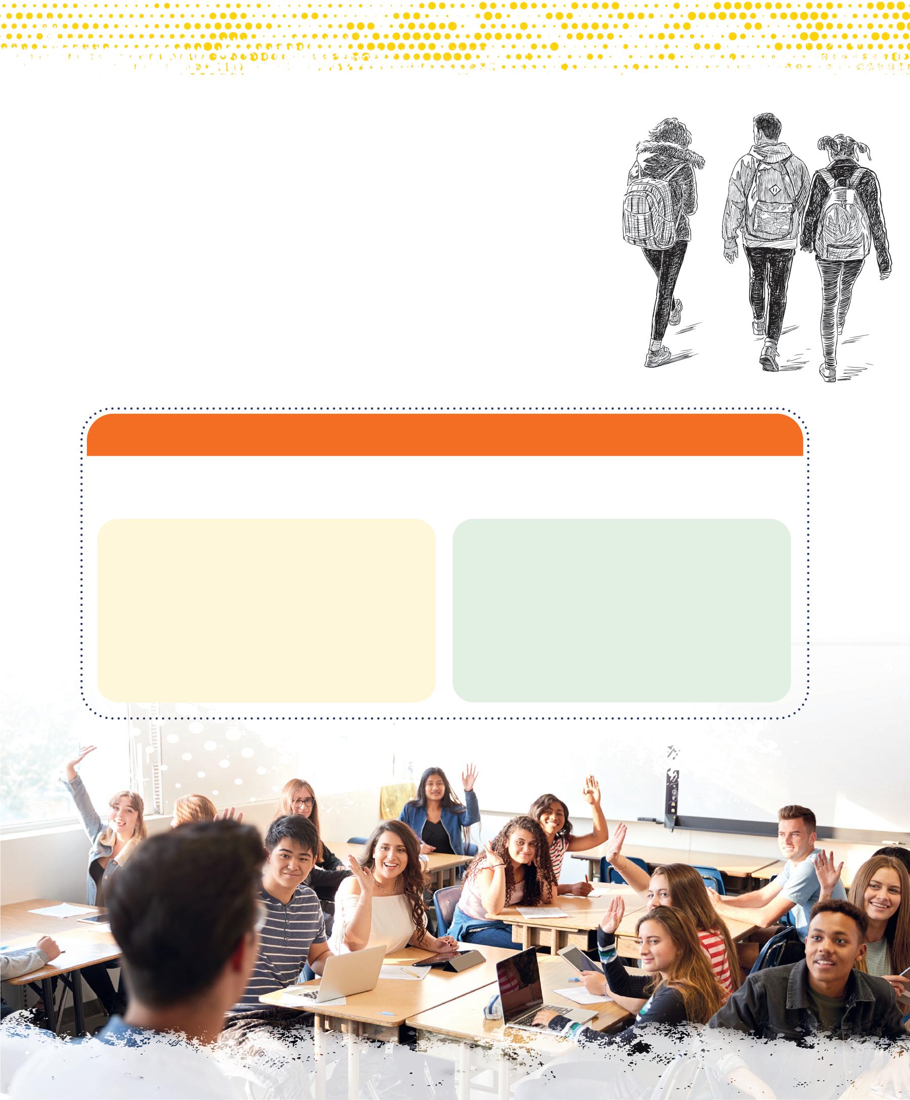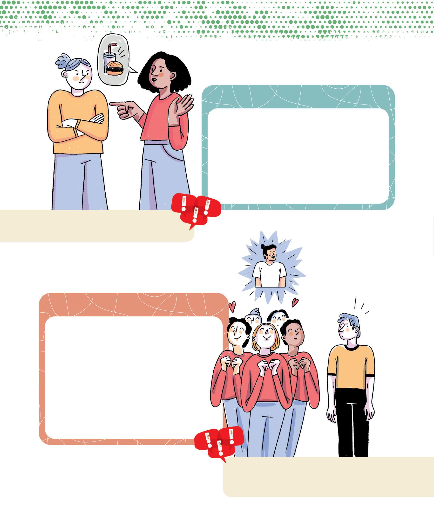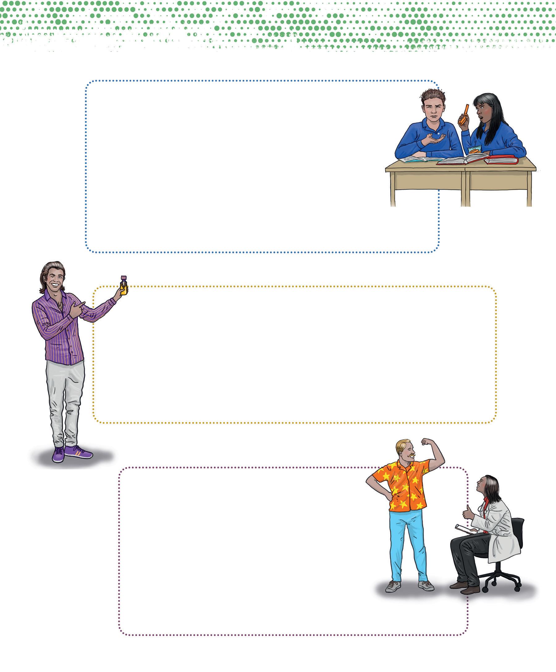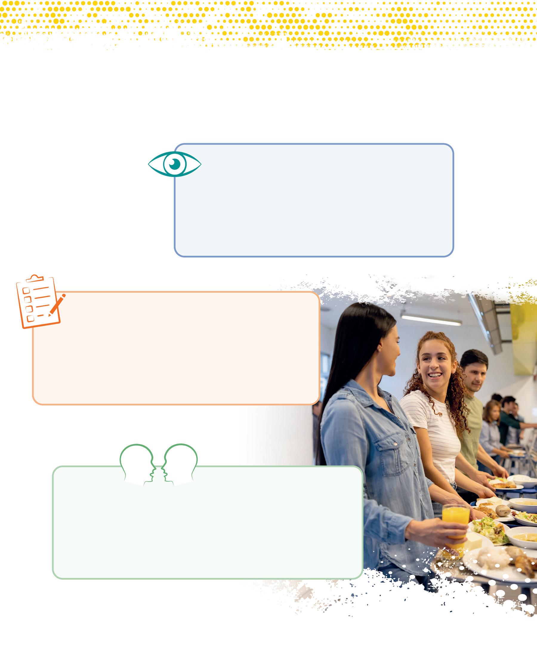 iStock.com / p. 164: young people in a cafeteria © Hispanolistic, 1411322814. Shutterstock.com / p. 7: adolescent with headphones © Ollyy, 86790025. p. 156: group of young people © Jose Calcina, 2436846845. p. 157: people in a meeting © klyaksun, 2183470883. p. 159: young people with backpacks © chronicler, 773688853; teacher in front of class © Monkey Business Images, 1332875000. p. 161: Gilbert © Inside Creative House, 2505339787; Kabir © insta_photos, 2192136373; Eve-Lyne © Wayhome Studio, 2408565635; Maude © VH-studio, 2408897357; Sylvain © stockfour, 1016723167; Véronique © Anelo, 2197757639; Gisèle © Image Point Fr, 174171395. p. 162: group of people, back view © oneinchpunch, 490906510. p. 163: donut, nuggets and fries © IDEA ROUTE, 2478397213. p. 165: salad © lilik ferri yanto, 2512542933. p. 166: tray with meal © Africa Studio, 1139822657. p. 169: shrimp, peanuts, eggs © New Africa, 1322462069. p. 178: funnel © SPF, 2301838831; person balancing with red and green balloons © kostasgr, 1961569669. p. 187: diverse silhouettes © melitas, 1857402163. p. 188: hands in conversation © Roman Samborskyi, 2357375783. p. 189: orange and yellow speech bubbles © Roman Samborskyi, 2357375783. p. 190: pointing hands © Roman Samborskyi, 2285057785. p. 191: pictograms (top to bottom): © chocolat-10, 2440624205; © chocolat-10, 2418376737; © mi-vector, 2383077379; © chocolat-10, 2418376737; © Rvector, 1790019863. p. 192: pictograms (top to bottom): © chocolat-10, 2440624205; © Rvector, 1790019863; © chocolat-10, 2440624205; © Fourleaflover, 2133348541; © Fourleaflover, 2079740932. p. 193: pictograms (top to bottom): © Uswa KDT, 1928826860; © Fourleaflover, 2079740932; © smx12, 2474395423; © Kida, 2000657552; © Realstockvector, 2456066677. p. 198: group selfie of teenagers © Jose Calsina, 2506806499.