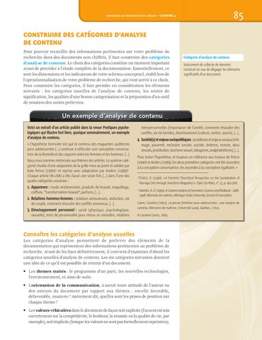 Un exemple d’analyse de contenu Voici un extrait d’un article publié dans la revue Pratiques psycho logiques qui illustre fort bien, quoique sommairement, un exemple d’analyse de contenu. « L’hypothèse formulée est que le contenu des magazines québécois pour adolescentes […] continue à véhiculer une conception conserva trice de la féminité et des rapports entre les femmes et les hommes. […] Nous nous sommes intéressée aux thèmes des articles. Le système caté goriel résulte d’une adaptation de la grille mise au point et validée par Kate Peirce (1990)1 et reprise avec adaptation par Anders (1999)2. Chaque article (N=268) a été classé une seule fois […] dans l’une des quatre catégories suivantes : 1. Apparence : mode vestimentaire, produits de beauté, maquillage, coiffure, “transformationbeauté”, parfums, […]. 2. Relations hommes-femmes : relations amoureuses, séduction, vie de couple, comment résoudre des conflits amoureux, […]. 3. Développement personnel : santé (physique, psychologique, sexuelle), tests de personnalité pour mieux se connaître, relations