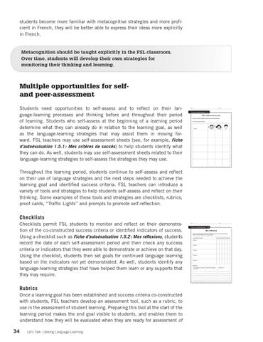 Multiple opportunities for selfand peer-assessment Students need opportunities to self-assess and to reflect on their language-learning processes and thinking before and throughout their period of learning. Students who self-assess at the beginning of a learning period determine what they can already do in relation to the learning goal, as well as the language-learning strategies that may assist them in moving forward. FSL teachers may use self-assessment sheets (see, for example, Fiche d’autoévaluation 1.5.1 : Mes critères de succès) to help students identify what they can do. As well, students may use self-assessment sheets related to their language-learning strategies to self-assess the strategies they may use. Throughout the learning period, students continue to self-assess and reflect on their use of language strategies and the next steps needed to achieve the learning goal and identified success criteria. FSL teachers can introduce a variety of tools and strategies to help students self-assess and reflect on their thinking. Some examples of these tools and strategies are checklists, rubrics, proof cards, “Traffic Lights” and prompts to promote self-reflection.
