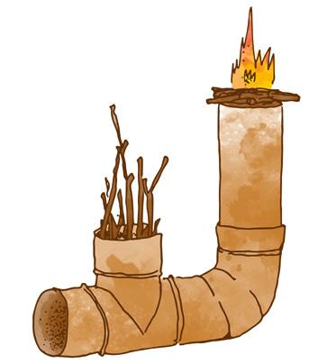 Le réchaud est constitué de sections de tubes et n’a pas de pieds. Dans le cas d’une utilisation nomade, il faudra le caler avec des pierres ; dans le cas d’une utilisation fixe, il pourra être scellé.