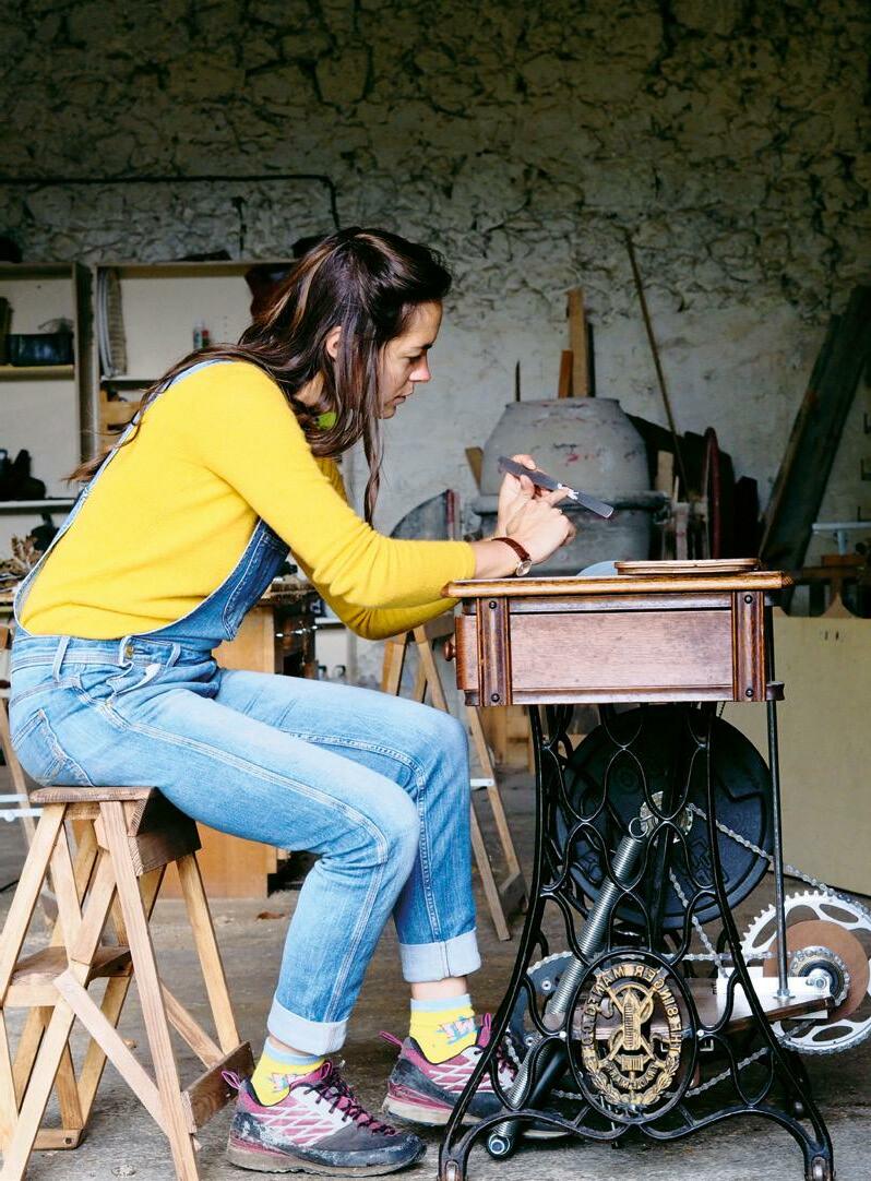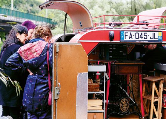 Dans notre atelier itinérant, une machine Singer convertie en combiné multi-outils tient une place importante. Elle nous permet de travailler partout de manière autonome, de limiter notre consommation électrique et de revisiter une énergie négligée : celle du corps (voir p. 113).